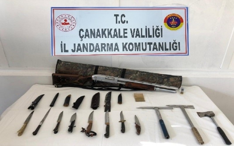 Çanakkale İl Jandarma Komutanlığınca yapılan çalışmalar neticesinde ve Biga Sulh Ceza Mahkemesinden alınan arama kararı gereğince T.D. isimli şahsın evinde ve eklentilerinde uyuşturucu madde arama köpeği “Roket” ve bomba arama köpeği “Afra”nın da katılımıyla yapılan arama neticesinde 8,2 gr uyuşturucu madde(esrar), 1 adet ruhsatsız özel yapım otomatik av tüfeği, 3 adet 15 cm el yapımı bıçak, 2 adet 13 cm el yapımı bıçak, 1 adet 18 cm el yapımı bıçak, 1 adet 11 cm el yapımı bıçak, 1 adet 8 cm el yapımı bıçak, 1 adet 30 cm el yapımı balta, 2 adet 32 cm el yapımı saplama demiri, 1 adet 12 kalibre fişek, ele geçirildi. Ele geçirilen malzemeler Cumhuriyet Savcısının talimatı ile Kriminal Daire Başkanlığına gönderilmek üzere muhafaza altına alındı. Şüpheli T.D. isimli şahıs ifadesinin alınmasına müteakip serbest bırakıldı.