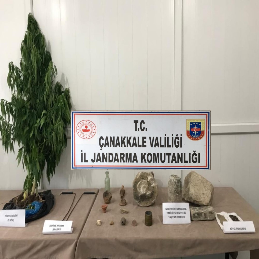Çanakkale’nin Bayramiç İlçesi, Kurşunlu Köyü, Aktaş mevkiinde Çanakkale İl Jandarma Komutanlığınca yapılan İstihbarak çalışmaları sonucunda B.B.Ö, M.Ö.Ö, M.Ö ile M.G isimli şahıslar kepçe ile izinsiz olarak kazı yaptıkları sırada suçüstü yakalandı. Olay yerinde ele geçirilen 1 adet kepçe ve 1 adet metal define arama aparatı ile şüpheli şahısların Ev, Eklenti ve Araçlarında yapılan aramalar sonucunda 9 Adet Hint keneviri bitkisi, 1 Adet Eski döneme ait 15x3 cm ebatında göz yaşı şişesi, 1 Adet Eski döneme ait 9x2 cm çapında kırık göz yaşı şişesi, 2 Adet Eski döneme ait yüz figürü olan 4x3 cm , 3x2 cm taş parçası, 1 Adet 3 cm çapında üzerinde Osmanlı tuğrası figürü bulunan sikke, 1 Adet 17x5 cm çapında Eski döneme ait cam şişe, 4 Adet Eski döneme ait kırık gözyaşı şişesi dip kısmı, 1 Adet 7x4 çapında metal tarihi eser, 1 Adet 24x9 ebatında mezar taşı, 1 Adet 18x6 cm tarihi eser niteliğinde taş parçası, 1 Adet 20x19 geometrik şekli olan üzerinde yazı bulunan taş parçası, 1 Adet 37x12 cm ebadında tarihi eser niteliğinde taş parçası, 9,21 gram siyah bitki tohumu,9,61 gram beyaz bitki tohumu ele geçirilerek Muhafaza altına alınmıştır. Olay ile ilgili şüpheli şahıslar göz altına alındı olup, şahıslar Soruşturmaya devam ediyor.