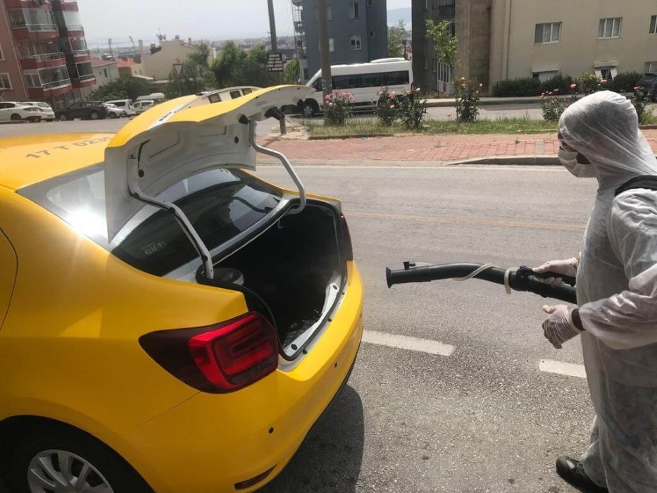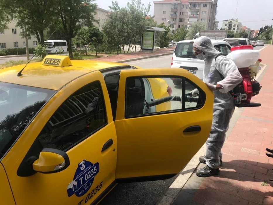 Çanakkale Belediyesi, salgın hastalık riskine karşı önlem çalışmalarını aralıksız olarak sürdürüyor.Bu kapsamda, kentimiz ortak kullanım alanları arasında yer alan taksiler ve taksi durakları da hem kentliler hem de taksici esnafının sağlığı için dezenfekte edildi.
