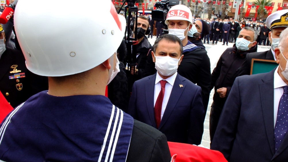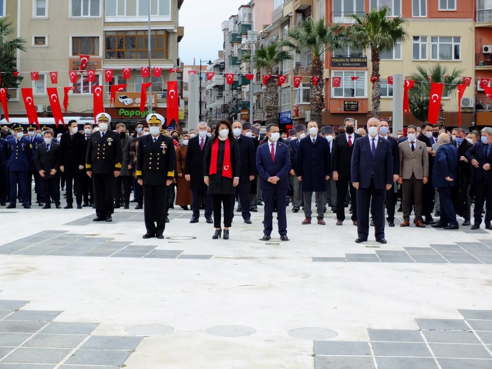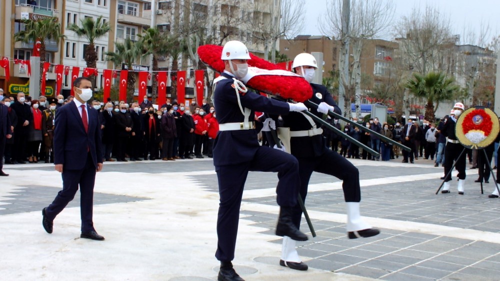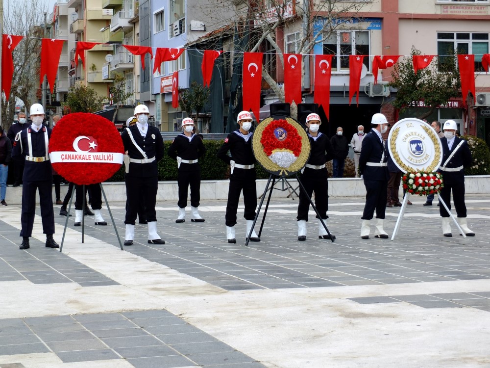 18 Mart Şehitleri Anma Günü ve Çanakkale Deniz Zaferinin 106. Yıl dönümü nedeni ile Her yıl olduğu gibi Cumhuriyet Meydanında tören düzenlendi. Pandemi nedeni ile sosyal mesafeye dikkat edilen törende daha önceki yıllarda 18 Mart stadında yapılan altın madalyanın ay yıldızlı bayrağımıza toka edilmesi töreni de Cumhuriyet Meydanında gerçekleştirildi. Törene Çanakkale Valisi İlhami Aktaş, Boğaz ve Garnizon Komutanı Tuğamiral Mehmet Cem Okyay, Belediye Başkanı Ülgür Gökhan, AK Parti Çanakkale Milletvekili Jülide İskenderoğlu, Avustralya Çanakkale Konsolosu Lucas Robson, Avustralya Askeri Ateşesi Albay Richard Campell, askeri erkan, sivil toplum kuruluşu temsilcileri, siyasi parti temsilcileri ve vatandaşlar katıldı. Tören Atatürk heykeline çelenk konuşması ile başladı. Atatürk heykeline ilk çelengi Çanakkale Valisi İlhami Aktaş sundu. Ardından Boğaz ve Garnizon Komutanı Tuğamiral Mehmet Cem Okyay ve Belediye Başkanı Ülgür Gökhan çelenklerini sundu. Türkiye Büyük Millet Meclisi (TBMM) tarafından 1994 yılında, 253 bin şehit adına, 3972 Sayılı Kanunla, Çanakkale'ye verilen ve üzerinde 'Çanakkale Geçilmez' yazan altın madalya Türk Bayrağına Vali Aktaş tarafından toka edildi. Altın madalyanın toka edilmesinin ardından saygı duruşu bulunuldu. Saygı duruşu sırasında Türk Deniz Kuvvetlerine ait TCG - Burgazada isimli korvetten 17 pare top atışı gerçekleştirildi. Ardından İstiklal Marşımız okundu.