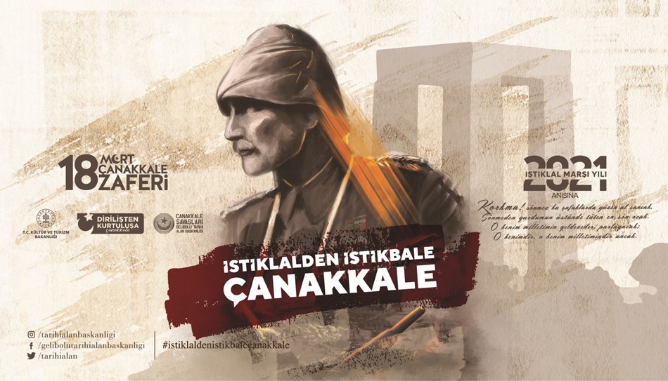 “Çanakkale Savaşları Gelibolu Tarihi Alan Başkanlığınca düzenlenen “18 Mart Şehitleri Anma Günü ve Çanakkale Deniz Zaferi” kapsamında yapılan tören ve kutlamaları tüm ülkede ortak bir çizgide buluşturmak ve coşku ile kutlamak adına 2018 yılından itibaren yapılan her tören bir tema kapsamında gerçekleştirilmektedir.2018 yılında “Birileri Var” , 2019 yılında “Dirilişten Kurtuluşa Bir Duruştur Çanakkale” , 2020 yılında “Hilal’in Gölgesinde Saklı Abideler” olarak belirlen tema 2021 yılı için “İstiklalden İstikbale Çanakkale” olarak belirlenmiştir.18 Mart günü Şehitler Abidesi’nde düzenlenecek olan törenin 106. yılında “İstiklalden İstikbale Çanakkale” temasının belirlenmesinde ise 2021 yılının “İstiklal Marşı Yılı” olması etkili olmuştur. 2021 yılı Türkiye Büyük Millet Meclisimizin kararı ile “İstiklal Marşı Yılı” olarak ilan edildi. İstiklal mücadelemizin biri silahla diğeri kalemle gerçekleşmiştir. Biri bu toprağın yiğitlerinin, bedenlerini siper ederek savundukları zafer, bir diğeri ise Milli Şairimiz Mehmet Akif Ersoy tarafından altın harflerle yazılan İstiklal Marşımızdır. Çanakkale Savaşları Gelibolu Tarihi Alan Başkanlığınca yürütülen “18 Mart Şehitleri Anma Günü ve Çanakkale Deniz Zaferi”nin 106. Yıl dönümü anma programı, ilgili bakanlıkların, kamu kurum ve kuruluşların iş birliğinde 18 Mart 2021 tarihinde gerçekleştirilecektir. Mehmetçik'in hatırasının, inancının, cesaretinin, azminin, manevi mirasının, milli birlik ve beraberliğin harcı olan Çanakkale Zaferi'ni kazandıran yüksek ruhun kuşaktan kuşağa yaşatılması adına düzenlenecek törenlere ait bilgi, belge, tasarım ve görsel birliğin sağlanması amacıyla kamu kurum ve kuruluşları, yerel yönetimler ve sivil toplum örgütleri arasında koordinasyonun gerçekleştirilmesi amacıyla talep edilen materyallere Tarihi Alan Başkanlığı tarafından açılan "www.18martetkinlikleri.com" sitesinden yüksek çözünürlüklü olarak erişim sağlanacaktır. "İstiklalden İstikbale Çanakkale" adı altında hazırlanan 1 dakikalık kamu spotu, televizyon kanallarında hafta etkinlikleri kapsamında gösterilecektir.” ifadelerine yer verildi.