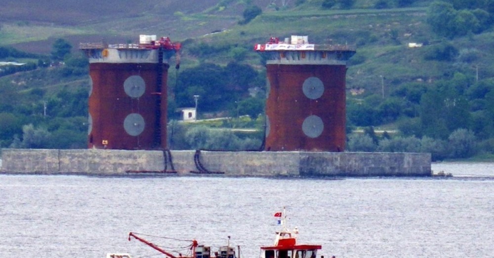 ÇANAKKALE BOĞAZI'NA İNŞA EDİLEN 1915 ÇANAKKALE KÖPRÜSÜ'NÜN YAKLAŞIK 1 AY ÖNCE BATIRILAN, AVRUPA VE ASYA YAKASI KULE KESONLARI ÜZERİNDE AYAKLAR YÜKSELMEYE BAŞLADI.