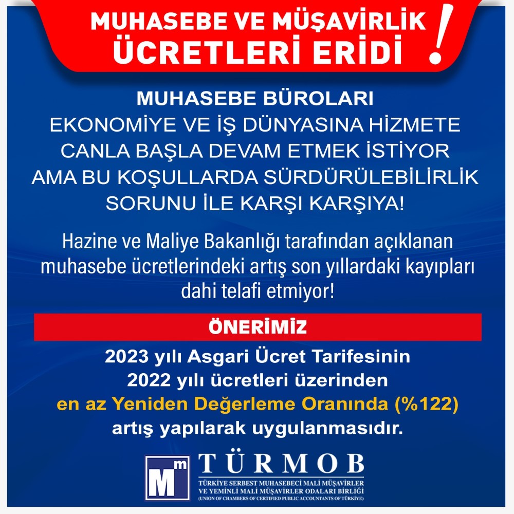 Meslek mensuplarının yıllar itibariyle vermekte oldukları hizmetler nedeniyle elde ettikleri ücretlerdeki değişim (artış oranı) ile bu hizmetlerin sunumu için katlanılan maliyetlerdeki değişimin (artış oranının) paralel bir şekilde olması beklenmektedir. Ancak 2017 yılı ile 2022 yılları arasında asgari ücret tarifemiz %95 artmıştır. Buna karşılık aynı yıllar dikkate alındığında; Asgari ücretlerin işverene olan maliyetlerindeki değişimi yüzde 247, 2023 yılı artışı dahil edildiğinde yüzde 590, Üretici fiyat endekslerindeki değişim yüzde 296, tüketici fiyat endekslerindeki değişim yüzde 155 ve bu iki endeksin ortalamasındaki değişimler yüzde 224, Amerikan Doları kurundaki değişimler yüzde 393, Enerji (elektrik, akaryakıt) fiyatlarındaki değişimler yüzde 745, Kağıt fiyatlarındaki değişimler yüzde 300, oranında artmıştır. Mali Müşavirlik ücret tarifesindeki ücretler, maliyetlerdeki artışlar nedeniyle erimiştir. Yukarıdaki veriler açıkça göstermektedir ki, yıllar içerinde yaşanan kayıpları dahi karşılamaktan uzak olan yüzde 85’lik artış, bu erimeyi derinleştirmektedir. Mali Müşavirlik ücretlerinde yıllar itibariyle meydana gelen erime ve bu erimenin nasıl giderileceği tarifenin yayımından önceki 2 aylık süreçte ilgili bürokratlara, siyasilere ve Sayın Hazine ve Maliye Bakanına arz edilmiştir. Ancak, haklılığı istatistiki verilerle ortaya konulan bu talepler maalesef karşılanmamıştır. Hazine ve Maliye Bakanlığı tarafından 30 Aralık 2022 tarihli Resmi Gazete’de açıklanan muhasebe ücretlerindeki yüzde 85’lik artış, bürolarımızın yaşadığı büyük sıkıntıyı telafi etmeyeceğinden, ücretlerin en az yeniden değerleme oranı olan yüzde 122 oranında artırılarak uygulanması gerekmektedir.”