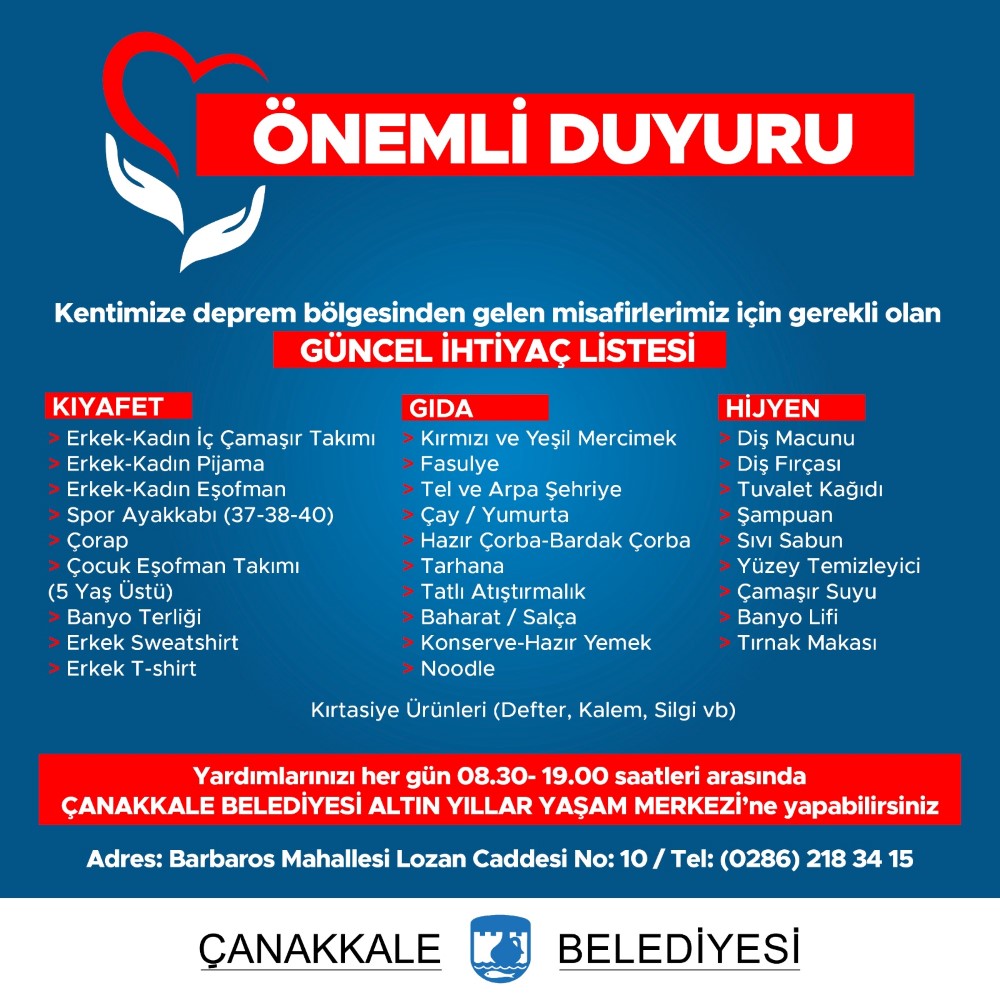 Deprem bölgelerinden Çanakkale gelen depremzedelerin ihtiyaçlarını karşılamak için Çanakkale Belediyesi Altın Yıllar Yaşam Merkezinde butikler oluşturulmuştu. Çanakkale’ye yerleşen depremzedeler Altın Yıllar Yaşam Merkezine gelerek oluşturulan butiklerden depremzedeler ihtiyaçlarını karşılıyor. Bu kapsamda Çanakkale belediyesinden yapılan yazılı açıklamada yeni ihtiyaç listesi açıklandı. Açıklamada “ Kentimize deprem bölgesinden gelen misafirlerimiz için gerekli olan güncel ihtiyaç listesi;” adı altında şu ihtiyaç listesi yayınlandı