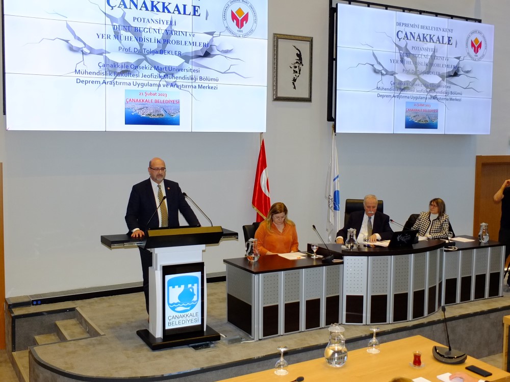 Yaşanan büyük deprem felaketinin ardından Çanakkale’de alınacak deprem önlemlerinin konuşulması ve 10 maddeden oluşan “Çanakkale Belediyesi Sorumluluk Sahasındaki Yerleşim Alanlarında Olası Deprem Zararlarının Azaltılması Amacıyla Alınması Gerekli Önlemler” paketinin oylanması için Olağanüstü toplanmıştı. Olağan üstü meclisi toplantısında Çanakkale Onsekiz Mart Üniversitesi, Deprem Araştırmaları Uygulama ve Araştırma Merkezi Müdürü Profesör Doktor Tolga Bekler Çanakkale Belediye Meclisi üyelerine “Depremi Bekleyen Kent Çanakkale “ başlığı ile “Dünü Bugünü Yarını Yer Mühendislik Problemleri“ konulu sunum gerçekleştirdi. Profesör doktor bekler sunumunda Çanakkale’ de deprem risklerini anlattı. Türkiye’nin çok büyük bir deprem felaketi yaşadığının altını çizen Profesör Doktor Tolga Bekler sunumunda depremin gerçek ve tüm yıkıcılığı ile hayatımızda olmaya devam edeceğini ifade ederek “Depremler ne kadar sürecek? Depremler bu şekilde en az bir 3-4 sene daha sürmesi bekleniyor. Daha bitecek mi? Bitmeyecek. Bitmemesi de gerekiyor. Depremlerin bitmesi demek daha büyük sıkıntılar demektir. Yani artçı şokların ya da artçı depremlerin benzer yer içerisindeki hareketlilik yerin doğası gereği, dinamiği gereği, fiziği gereği kalp atışları gibi. Kalp atışınız olmadığı sürece hayata devam etmemiz ya da diğer fonksiyonların yerine gelmesi imkansız. Dolayısıyla bu depremler devam edecek ve 2017 Ayvacık depreminden sonra hala aktivite nasıl devam ediyorsa Kahramanmaraş depremleri de devamıyla ancak bu kadar büyük olmamakla beraber devam edecektir” dedi.