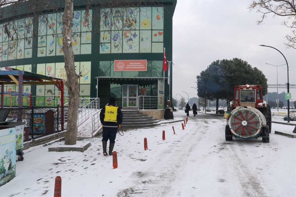 Tüm yurtta etkili olan kar yağışı ve soğuk hava, Biga’da da gece saatlerinden itibaren etkisini artırdı. Meteoroloji Genel Müdürlüğü, Marmara Bölgesi için sarı ve turuncu kodlu uyarı verirken, kar kalınlığının 5 cm olduğu Biga ilçe merkezinde Biga Belediyesi ekipleri gece saatlerinden itibaren yolları temizledi. Ekipler, don ve buzlanma olaylarına karşı ana ve ara yollar ile kaldırımları sık sık tuzlama çalışması yaptı. Biga Belediye Başkanı Bülent Erdoğan yaptığı açıklamada, “Biga'mızda etkisini gösteren kar yağışına karşı teyakkuzdayız. Ekiplerimiz yollarda küreme ve tuzlama çalışmalarına devam ediyor. Şehir merkezimizde kar kalınlığı yaklaşık 5 santimetre olurken ekiplerimiz herhangi bir olumsuzluk yaşanmaması için canla başla çalışmalarını sürdürüyor. Yol temizleme, tuzlama ve açma işlemi yapan ekiplerimiz, vatandaşlarımızın mağdur olmaması için mücadele ediyor. Şu anda şehir merkezimizde tüm ana ve ara halterler açık durumdadır ama don ve buzlanma olaylarına karşı dikkatli olmalıyız. Kıymetli hemşehrilerimize zorunlu olmadıkça araçlarıyla trafiğe çıkmamalarını tavsiye ediyoruz. Herhangi bir olumsuzluğa karşı Alo 153 veya 315 00 00 telefon numarasından ve 0530 133 18 60 WhatsApp hattından bizlere 7/24 ulaşabilirler” dedi.