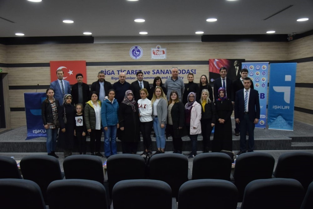 İŞKUR Biga Hizmet Merkezi ve Biga Ticaret ve Sanayi Odası işbirliğinde düzenlenen Girişimcilik Eğitiminin sonuncusu tamamlandı. Son eğitim kadınların çoğunluğunu oluşturduğu grup ile tamamlanırken, İŞKUR ve Biga Ticaret ve Sanayi Odası yönetici ve yetkilileri tarafından bilgilendirme yapıldı. 4 gün süren bu eğitimde kursiyerler eğitimci Ebru FİDAN eşliğinde girişimcilik konusu ile ilgili geniş bilgi edinirken aynı zamanda KOSGEB uzmanlarının vereceği eğitimle KOSGEB desteklerinden nasıl yararlanabileceği konusunda bilgi edindiler. Biga İŞKUR Hizmet Merkezi müdürü Ahmet UZUNER ve Biga Ticaret ve Sanayi Odası Meclis Başkanı Melih AKYIL girişimci adaylarına İŞKUR hizmetleri ve girişimcilik hakkında bilgilendirme yaptıktan sonra kursiyerlere hayırlı olsun dileklerini aktardılar.