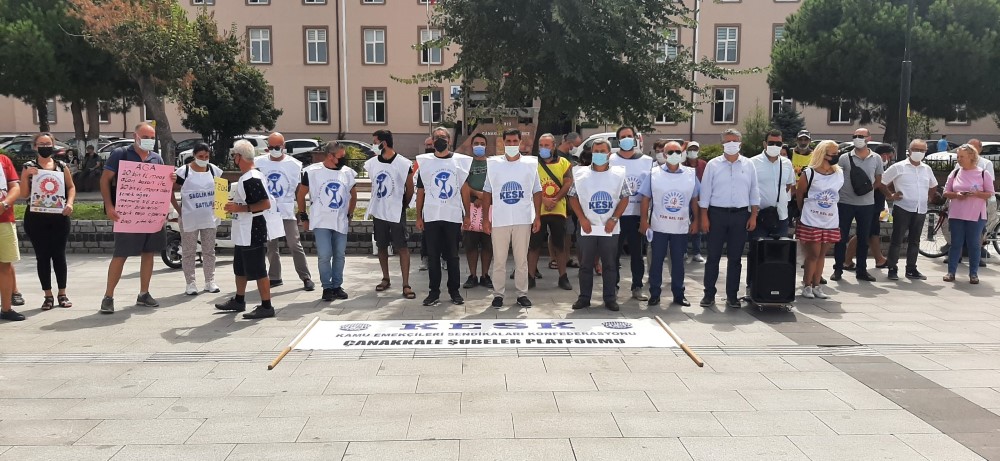 Çanakkale’de de gerçekleştirilen iş bırakma eyleminde KESK’e bağlı üyeler Çanakkale Valiliği önünde bir basın açıklaması gerçekleştirildi. Valilik önünde gerçekleştirilen  Basın açıklamasını okuyan   Tüm Bel - Sen Başkanı Bülent Barın “5,5 milyon kamu emekçisini ve emeklisi olarak ailelerimizi de kattığımızda 20 milyonluk geniş bir kitlenin geleceğini doğrudan ilgilendiren toplu sözleşme görüşmeleri bugün taraflar arasında varılan mutabakatla sona ermiştir. Hemen baştan ifade edelim ki, günlerdir bizden adeta kaçırılan,  kapalı kapılar ardında yapılan görüşmelerin ürünü mutabakatın adı ölümü gösterip sıtmaya razı etme mutabakatıdır. Bilindiği üzere KESK olarak hükümetin 12 Ağustos’ta yaptığı ilk teklifine ilişkin basın toplantımızda bugün varılan mutabakatın içeriğine ilişkin önemli tehlikeye dikkat çekmiştik. Yıllardır birikmiş hiçbir temel sorunumuzu çözmeyen, bir iki puanlık maaş artışları ve sonraki yıllara ertelenen vaatlerle cilalanan bir teklifin mutabakatla sonuçlanmasının çok güçlü bir ihtimal olduğunu ifade etmiştik. Ne yazık ki bugün ortaya çıkan tablo tam da budur.