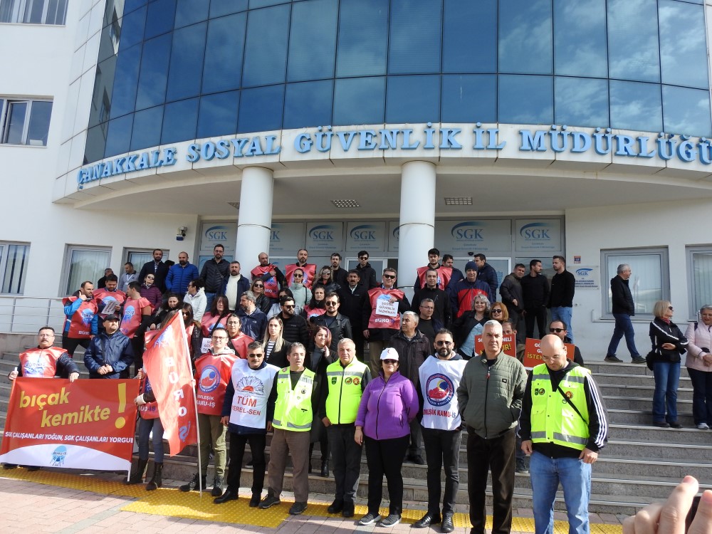 SGK Çalışanları, EYT düzenlemesi kapsamında artan iş yükleri sebebiyle bir günlük iş bırakma eylemi gerçekleştirdi. Çanakkale Sosyal Güvenlik Kurumu Çalışanları SGK Binası önünde toplandı ve kurum önünde yapılan basın açıklamasına destek verdi. Birleşik Kamu İş Konfederasyonu’na bağlı sendika Büro İş adına SGK İl Binası önünde gerçekleştirilen iş bırakma eylemine aynı iş kolundaki diğer sendikalarda destek verdi. Birleşik Kamu İş Konfederasyonu’na bağlı sendika Büro İş sendikası adına basın açıklamasını sendika üyesi Eylem Kacar okudu. Kacar Yaptığı açıklamada "Sosyal Güvenlik Kurumu uzunca bir süredir, 3600 Ek Gösterge, EYT ve Yapılandırma kanunları ile gündemde olmayı sürdürüyor. Hal böyleyken Kurum personelinin mağduriyetleri de katlanarak artıyor. Öyle ki asgari ücret düzeyinde olan maaşlarla hayatını idame ettirmeye çalışan kurum personelinin; iş yoğunluğuna, mobbinge ve yaşanan strese dayanacak gücü kalmamıştır. Psikolojik sorunlar başta olmak üzere kalp krizine varıncaya kadar birçok sağlık sorunu mesai arkadaşlarımız arasında baş göstermiştir. Yeni atanan memur arkadaşlarımız ise göreve başladıktan kısa bir süre sonra istifa ederek memleketlerine geri dönmektedirler. Neden mi? Maaşlarımız kiralarımızı ödemeye dahi yetmemektedir. Hak kayıplarını ve mağduriyetlerini gündeme getirmek adına ocak ayı itibariyle periyodik olarak yaptığımız iş yavaşlatma, iş bırakma eylemleri ve basın açıklamaları ile seslerini duyurmaya çalıştıklarını ifade eden Kacar, " Maalesef bugüne kadar hükümet tarafından SGK personelinin kronikleşmiş sorunlarını çözecek ve mağduriyetini giderecek tek bir somut adım atılmadı.  Kaldı ki sayın bakanın ilave fazla mesai ücreti verileceği ‘müjde’sinin ardından ayda 100 saat fazla çalışma ile karşılığında ödenecek 54 tl tutarındaki ücret de müjdelenmiş oldu. Aylardır yetkilileri uyarıyorduk; önlem alın, almazsanız vatandaşımız mağdur olacak diyorduk. Şimdi ise mevcut personel sayısı ile ortaya çıkan iş yükünün sonuçlandırılamayacağı öngörüyorlar fakat çözümü 100 saatlik fazla çalışmada buluyorlar! Ücret tutarı da fazla çalışma süresi de insan onuruna yaraşır bir düzenleme değildir. Normal çalışmanın üzerine 100 saatlik fazla çalışmanın nasıl yapılacağını düşündüler mi acaba? Biz kalıcı çözümler istiyoruz. Bugün örgütlü olduğumuz Sosyal Güvenlik İl/Merkez Müdürlüklerinde iş bırakıyoruz, iş bırakmaya mecbur bırakıldık. Defalarca dile getirdik, SGK çalışanları yoğun, yorgun ve yoksul dedik. Sesimizi sağır sultana duyurduk, fakat Kurum Başkanlığı ve hükümete duyuramadık. Fakat bıkmadan, usanmadan anlatacağız; çünkü biz haklıyız" ifadelerine yer verdi.
