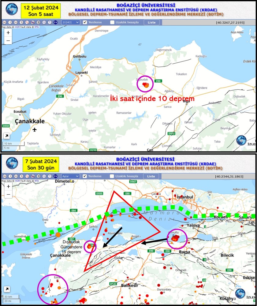 Çanakkale Onsekiz Mart Üniversitesi (ÇOMÜ) Mühendislik Fakültesi Jeoloji Mühendisliği Bölümünden emekli Prof. Dr. Doğan Perinçek, Çanakkale’de depremlerin ardından açıklamalarda bulundu. Haritalı görsellerle paylaşımlarda bulunan Prof. Dr. Perinçek, “(12 Şubat) 14.13 ile 16.28 arasında yaklaşık iki saat içinde üsteki haritada daire içinde gösterilen yerde, Hisarlı, Gürgendere köyleri dolayında 12 küçük deprem yaşadık. Depremlerin bugün olmasa bile, gelecekte devam edeceğini düşünüyorum. Neden? Zira aynı bölgede 7 Şubat gününde ve daha önceki aylarda da çok sayıda deprem olmuştu. Deprem olan alan şeytan üçgeni olarak tanımladığım bölgenin hemen sınırında kalıyor. Marmara Denizi batısında olan depremler, bu bölgede biriken enerjiyi, Biga dolayına ilettiği tezini, şeytan üçgeni içinde olan depremlerin dağılımına bakarak desteklemek mümkün. Ayrıca Gemlik dolayında olan depremlerde batı yönde Biga, Erdek, Bandırma yönünde enerji transfer ettiği düşünülmektedir. Kanımca, hem Tekirdağ yönünden hem de Gemlik yönünden Biga dolayına enerji transferi söz konusu. Şeytan üçgeni, bir yılda ortaya çıkmadı. Son beş yıldır söz konusu alanda her gün depremleri gözlüyor ve analiz ediyorum. Bu çalışma 5 yıl boyunca, şeytan üçgeni içinde komşu bölgelere göre daha fazla deprem olduğunu gösterdi. Bölgede olan tarihsel depremlere baktığımızda onların üzerinden 250 yıldan daha fazla bir zaman geçtiğini görüyoruz. 117 yılında Gemlik ile Bandırma arasında yıkıcı bir deprem kayıtlarda var. Bu deprem ile Kyzikos ve Parion kentleri yerle bir olmuş. Parion antik kentinde arkeologlar ile birlikte yaptığım çalışmada 117 depreminin, daha önce ve sonra olan 2 depremin izlerini de buldum. Parion antik kentinin kuzey yarısı söz konusu deprem sırasında, kentin ortasından geçen bir fay nedeniyle 1,5 metre yükselmiş. Bu fayın deprem sırasında oluştuğunu gösteren çok sayıda verimiz var” ifadelerini kullandı.