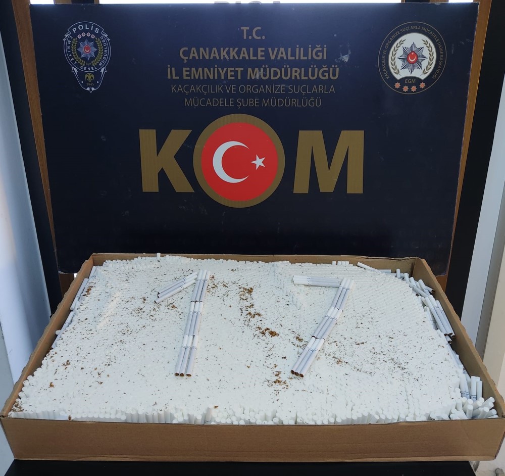 Çanakkale Emniyet Müdürlüğü Kaçakçılık ve Organize Suçlarla Mücadele Şube Müdürlüğü ekiplerince Çanakkale Merkezde Sigara Kaçakçılığıyla Mücadele kapsamında, yapılan istihbarat çalışmalarında; E.Ç,H.N.A ve U.A isimli şahısların adresinde arama yapıldı.Yapılan arama sonucunda, İki adet karton kutu içerisinde her birinde 200 adet makaron olan 100 karton toplam 20.000 dal bandrolsüz boş makaron, Plastik poşetler içerisinde her birinde 20 adet 75 paket toplam 1.500 dal doldurma sigara, 4 adet üzerlerinde CE4 Electronic Cigaretta ibaresi bulunan gümrük kaçağı elektronik sigara, 5 adet üzerlerinde GEORGE KARELIAS AND SONS ibaresi bulunan gümrük kaçağı tütün, 4 adet üzerlerinde OLD HOLBORN ibaresi bulunan gümrük kaçağı tütün ele geçirildi. Ele mgeçirilen tüm mallara el kondu ilgili el konuldu. Şüpheli E.Ç,H.N.A ve U.A isimli şahıs hakkında 5607 SKM suçundan adli işlem yapıldı. şahıslar savcılık talimatıyla serbest bırakıldı.