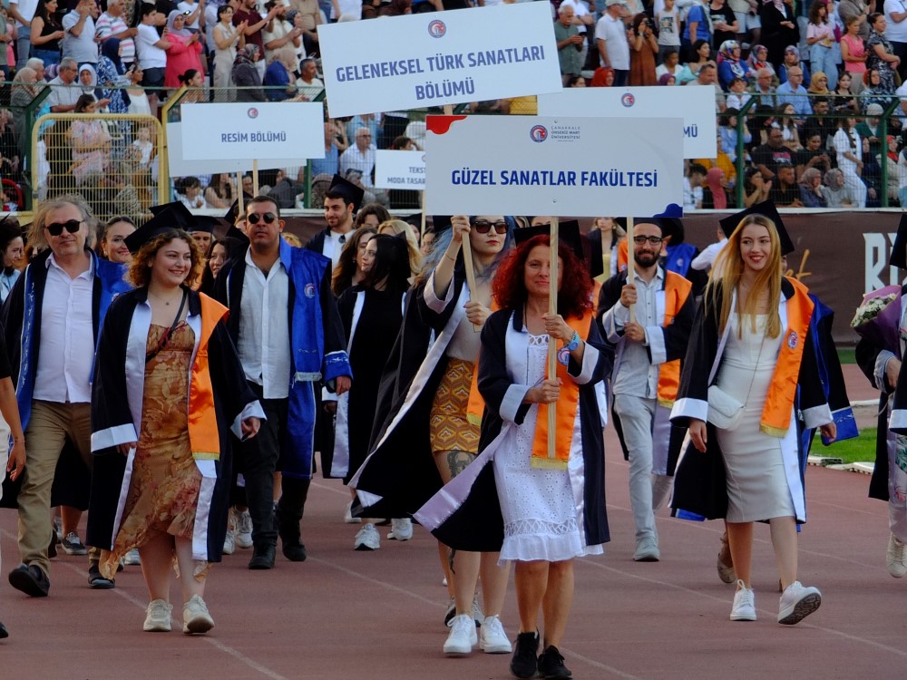 Öğrencilerin yürüyüşünün ardından törene geçildi. Saygı Duruşu ve İstiklal Marşının ardından programa geçildi ve İlk Konuşmayı mezunlar adına Filiz Tekeli gerçekleştirdi. Okul birincisi olan ve öğrenciler adına konuşma yapan Tekeli “Anayurdun Bozkırlarından doğan ve Dünya’nın üçte ikisine yayılan Türk sanatının n eşsiz, motif, desen kompozisyonlarının bir çizgiden gelerek, evrenin sonsuzluğunu ve dengesini, suyun akışkanlığından gelerek evrenin yaratılış prensiplerini ve bir çiçeğin kesişinden başlayarak , cennet bahçelerinin güzelliğini bir sanat anlayışı ile takdir edildiğini mezun olduğum Geleneksel Türk Sanatları Bölümünde öğrendim. Bir noktanın ölçüsünün, konumunun metinde neyi ifade ettiğini her hafta en az 30 saat boyunca yılmadan hüsnü hat sanatlarıma çalışırken idrak ettim. Tek bir kalem ve fırça hareketinin bir desene, bir esere neler kattığını ve haftalarca emek ile üretilmiş bir ödevi nasıl yok ettiğini bütün arkadaşlarımın da çok iyi bildiği gibi deneyimledik. Ama hiç birimiz yılmadık, daha çok çalışıp daha iyisini ürettik. Geleneksel Türk Sanatı Öğrencilerine, sanatın özünü, mitolojisini, değer yargılarını, nereden gelip nereye evrildiğini ham maddesinden sırrın sırrına nasıl vardığını, renkler, motifler ve harfler ile bütün duygularımızı ortaya çıkaracağımızı, çömlekçi çarkından başlayarak çinilik, tezhip fırçası ve hat kalemi ile nerelere ulaşacağımızı bize özgürce öğreten bölüm hocalarımıza teşekkür ederim. ‘Öğrenmenin yaşı yok’ desem de öğrenme koşulları siz ailelerin özverileri ile gerçekleştiği için bütün mezunlar ve öğrenciler adına tüm ailelere, bize verdiğiniz destekler için teşekkür ederim. Sevgili mezun olacak öğrenci arkadaşlarım, yeni hayatlarınızda başarılı olacaksınız. Sormaktan, sorgulamaktan korkmayın. Sizler güvenli ve donanımlı bireyler olarak sizi ileriye taşıyacak bilgiye sahip olun. Yolunuz ve bahtınız açık olsun” dedi.