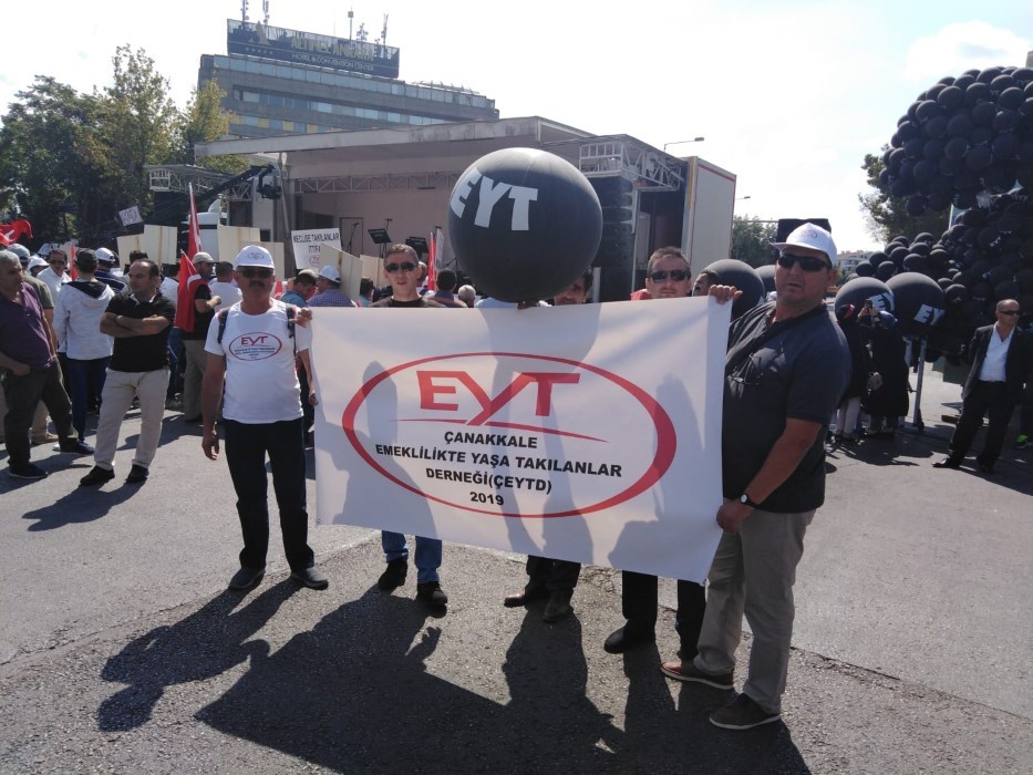 Kısa adı EYT olan ve Kamu oyunun Emeklilerde Yaşa Takılanlar olarak bildiği birliktelik milyonlarca çalışanın mağdur eden yasanın çıkışının 20 yılı nedeni ile Ankara miting düzenledi.Türkiye'nin dört bir yanından Cumartesi gecesini Pazara bağlayan gece yarısı Ankara’ ya gelen gelen EYT' liler saat 12'de Tandoğan Meydanı'nda toplanmaya başladı. Çanakkale, Çan ve Biga EYT’ liler den oluşan (Emeklilikte Yaşa Takılanlar) ortalama 100 kişi Ankara’ da yapılacak miting için Çanakkale’ den Ankara’ ya hareket etti. Tandoğan da yerini alan Çanakkaleli EYT’ liler haklı sorunlarına çözüm talep etmek için “Alın Terinin Karşılığı Olan Haklarımızı İstiyoruz” mesajı verdiler. Siyasi partilerin, temsilcilerinin ve sendikaların da katılım gösterdiği mitinge, Ankara Büyükşehir Belediye Başkanı Mansur Yavaş’ da katıldı. Ayrıca dernek kurma çalışmalarını hızla sürdüren EYT’ liler 11 ilde derneklerini kurarak federasyon olma yolunda çalışmalar yapıyor. Türkiye genelinde kurulan EYT derneklerinin arasında Çanakkale’ de bulunuyor.