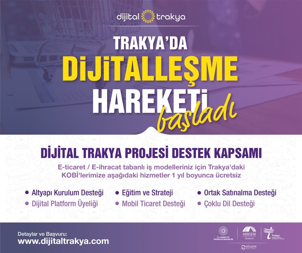 Koronavirüs salgını nedeniyle ekonomik sıkıntılar yaşayan işletmelere can suyu olacak olan “Dijital Trakya Projesi’nin temelleri atıldı. Trakya’daki oda ve borsaların paydaşlığı ile birlikte e-ticaret atılımı yapılacak ve üyeler bu girişimle Dünya’ya açılacak. “Dijital Trakya ile Kepenkleri Açma Vakti” sloganı ile Sanayi ve Teknoloji Bakanlığı, Trakya Kalkınma Ajansı ve Trakya Avrupa Birliği İş Geliştirme Merkezi ile paydaş olan Trakya’daki 26 oda ve borsaların desteğiyle kobilere nefes aldıracak olan e-ticaretin hamlesi yapıldı.Proje ile dijitalleşen işletmeler sınırlarını aşarak dünyanın dört bir yanına satış yapabilmelerine olanak sağlanacak. E-ticaret ve e-ihracat alt yapısı ve dijital platform üyeliği ile satışlar online ortamda yapılacak. E-ticaret/ e-ihracat tabanlı iş modelleri için Trakya’daki KOBİ’lere hizmetler 1 yıl boyunca ücretsiz sağlanacak.