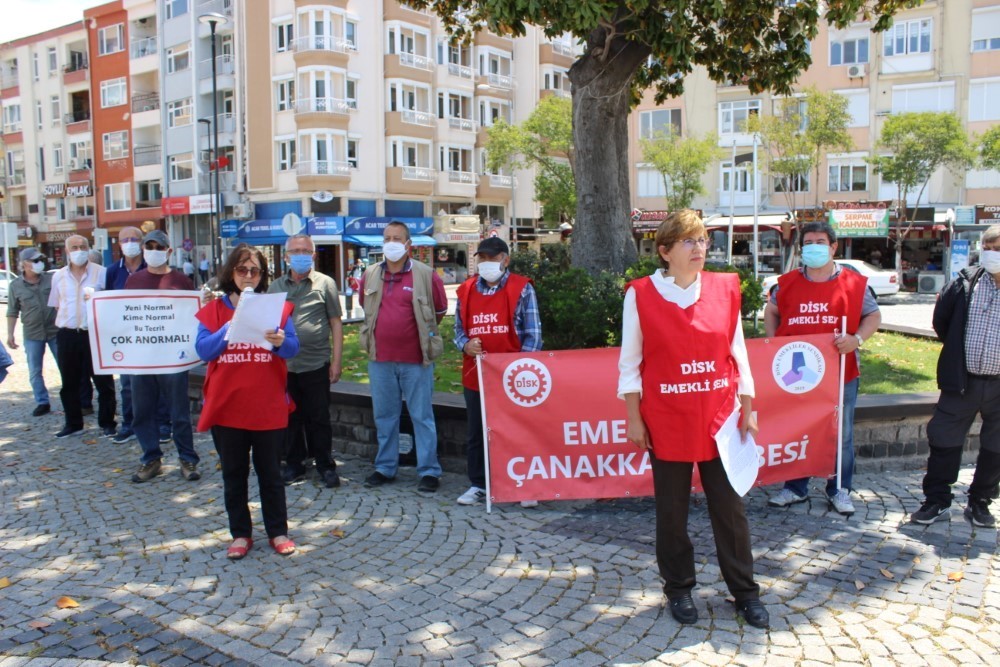 Yeni normalleşme süreci’nin 2. aşamasının 1 Haziran’ da başlaması ile bir çok yasak ve kısıtlama sona ereeken 65 yaş ve 65 yaş üzeri vatandaşların sokağa çıkma kısıtlaması kaldırılmamıştı. Sokağa çıkma yasağı devam eden 65 yaş ve 65 yaş üzeri vatandaşların sesi olmak adına bu yaş grubunun sokağa çıkma yasağını tüm Türkiye’ de eş zamanlı protesto eden Disk Emekli- Sen üyeleri yasakları protesto ettiler. Çanakkale’ de İskele Meydanında toplanan sendika üyeleri yasakları protesto ederken DİSK Emekli Sen Çanakkale Şubesi Yönetim Kurulu Üyesi Emine Pehlivan eylemde yaptığı açıklamada “21 Mart tarihinden bugüne sokağa çıkma yasağı 65 yaş üstü insanlarımız için sürüyor. Yeni normal adı altında yapılan gevşetmeler, Covid-19’un sadece 65 yaş üstüne ve sadece 65 yaş üstünden bulaştığı izlenimi veriyor. Zira yapılan düzenlemeler; alışveriş merkezlerinin açılması, şehir içi ve şehirler arası seyahat sınırlamalarının kaldırılması, restoran, kafe, çay bahçeleri ve hatta kreşlerin açılması 65 yaş üstü dışında herkesin eski yaşamına dönmesi anlamına geliyor. Bizler, Emekliler Sendikası olarak, bu sürecin başından itibaren söyledik; bir kez daha hatırlatalım. 65 yaş üstü emeklilerin, yaşlıların 'Evde Kalmaları' onları bir yere kadar pandemiden korurken, başta bu insanların rutin sağlık kontrolleri aksadığından pandemi dışındaki tüm sağlık sorunlarında artış yaşanacaktır. Sokağa çıkma yasağı bu insanlar için hareketsizlik anlamına gelmekte, hareketsizlik ise pek çok fiziksel ve zihinsel rahatsızlığa davetiye çıkarmaktadır" dedi.