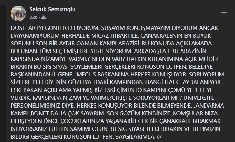 “Dardanos Orman Kampı, niteliği gereği kamusal bir alandır. Bu alan; orman emekçilerinin eğitimlerinin yapıldığı, emekçilerin faydalandığı doğayla iç içe, aynı zamanda vatandaşlarımızın kıyıdan denize erişimini sağlayan, kamuya hizmet eden müstesna bir alandır. Son zamanlarda iktidar tarafından ve onun kuyruğuna takılıp iktidarın açıklamalarıyla senkron olan bazı sesler duyulmaktadır. Oysa mesele, Dardanos Orman Kampı’nın bir nizamiye kapısı değil, toplum yararıdır. Bugün tartışılan mesele; bir kapının, bir nizamiyenin ya da bugüne kadar kimin girip giremediğinin tartışması değildir. Asıl mesele şudur: Böylesine değerli ve kamuya hizmet eden bir alanın kaderi, tepeden inme planlarla ve özelleştirme sevdasıyla mı belirlenecektir, yoksa yerel yönetimlerin ve halkın iradesiyle mi? Bu konu ile ilgili elbette Belediye Başkanı ve İl Genel Meclis Başkanı gibi halkın yerel temsilcileri beyanda bulunup, irade ortaya koyacaktır. Zira hem belediye meclisinde hem de il genel meclisinde parti ayırt etmeksizin bir irade ortaya konulmuştur. Bu irade ve söyleme karşı “Belediye Başkanından, İl Genel Meclis Başkanına herkes konuşuyor..” demek akıl tutulmasıdır ve halkın seçilmişlerine karşı saygısızlıktır. Yerel yönetimlerin açık talebi son derece nettir ve meşrudur. Yerel Yönetimler, tıpkı Çanakkale Belediyesi’nin Güzelyalı ve Dardanos’taki Halk Plajları’nda olduğu gibi halkın günübirlik ve eşit biçimde faydalanabileceği, kamuya açık bir alan yaratmak istemektedir. Talep edilen şey; öncelikle ve ivedilikle özelleştirme sürecinin durdurulması, alanın kamu yararı gözetilerek belediyeye tahsis edilmesi ve gerekiyorsa kamulaştırma yolunun açılmasıdır. Bundan daha meşru, daha demokratik ve daha halkçı bir talep olabilir mi? Bu mesele kurumlar arası çekişme değil; yerel yönetimlerin güçlendirilmesi ile merkezi idarenin tepeden inme kararları arasındaki tercihin somut bir örneğidir. Bizler şuna inanıyoruz: Kamuya ait kent belleği olmuş böyle alanlar kamusal nitelikte kalmalıdır. Kıyılar halkındır, Ormanlar kamunundur, Ve bu alanların geleceği, masa başında değil, yerinde ve halkla birlikte belirlenmelidir. Dardanos Orman Kampı’nın halkın kullanımına açık, doğası korunarak yaşatılan bir kamusal alan olarak kalması, Çanakkale halkının ortak talebidir.”