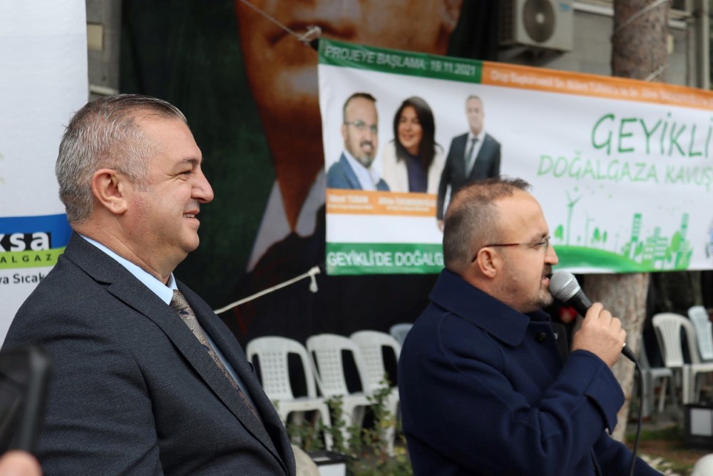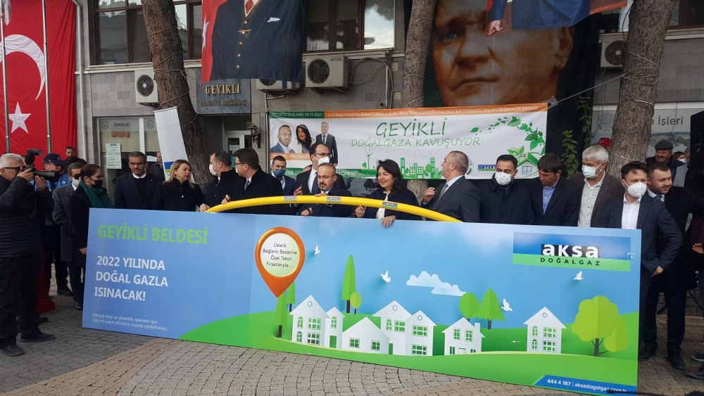 AK Parti Grup Başkan Vekili ve Çanakkale Milletvekili Bülent Turan törende yaptığı konuşmada Çanakkale’ye yapılan yatırımlarla ilgili bilgiler vererek “Geyiklimiz idari olarak belde olmasına rağmen başkanımızın yoğun gayretleri Ankara’da bizlerin yoğun destekleriyle AKS yöneticileri başta olmak üzere büyük bir motivasyonla artık Geyiklimize doğalgaz gelmesinin bugün besmelesini çekiyoruz. Bugün ilk kazmayı vuruyoruz. Bizde başlayan iş biten iştir. Göreceksiniz bugün başlayacağız inşallah bir sene sonra kış gelmeden Geyiklimizde artık evlerimizde doğalgaz sobalarının yanmaya başladığını hep beraber göreceğiz. Geyiklimize yazlık derdik ama göreceksiniz artık Geyiklimiz kışlık da olacak. Yazın gelen misafirlerimiz kışın da kalmaya başlayacaklar. Biz istiyoruz ki tüm Çanakkale’mizde doğalgazın gelmediği yer kalmasın. Geyikli ’ye bu yatırımın maliyeti 26,5 milyon lira. 160 kilometre boru döşenecek. 2022’nin sonbaharında Geyikli merkezdeki vatandaşlarımız doğalgazı evlerinde kullanmaya başlayacak. Hemen ardından yazlık bölgeleri geçeceğiz, onun da 3-4 senede planlanması var. Daha önce belde olmasına rağmen Karabiga ve Gümüşçay’da doğalgaz çalışmalarını başlattık. Bir müjde daha vermek istiyorum; Yenice ilçemizde doğalgaz açılışını fiili olarak yapmış olduk. Bu işleri yaparken parti ayrımı yapmıyoruz. Hangi belediye hangi partiden hiçbiriyle derdimiz yok. Örneğin Çardak beldesi CHP’li, ama doğalgaz hattına başladık. Açılışını inşallah seneye yapacağız. Dardanos, Güzelyalı bölgesine hep omuz verdik, güzel işler yaptık. Ayvacık için EPDK’ya gittik ısrarcı olduk, süreci başladı. Gelibolu’da çok geciktik, meclis kararı alamadık. Çok uğraştık. Ama en sonunda teşkilatımızın da oradaki ısrarı, meclis üyelerimizin gayretiyle belediye başkanının meclisi toplamasıyla o karar da alındı, Gelibolu’da yoluna girdi. Buradan duyuruyorum, Evreşe de hazırlığı yapsın. İnşallah yakında doğalgaz yakında oraya da gelme sürecine başlayacak” dedi.