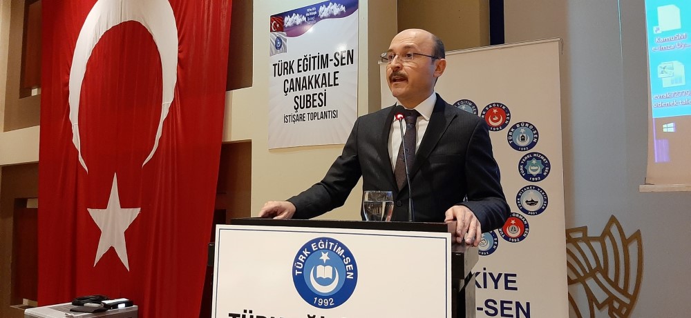 Kamu-Sen Çanakkale İl Temsilcisi ve Türk Eğitim Sen Çanakkale Şube Başkanı Resul Demirbaş’ın konuşmasının ardından kürsüye Türk Eğitim Sen Genel Başkanı Talip Geylan geldi. Çanakkale şube’ nin yetki alması ile ilgili azimli mücadelesinden dolayı emeği geçen herkese teşekkür eden Geylan konuşmasında “Türk Eğitim Sen, Türkiye Kamu Sen Şu an Türk Memur sendikalarının Amiral gemileridir, Adam gibi Sendikacılığın adresi, yoıl başçısı, kutup yıldızıdır. Bugün ülkemizde eninim ki tüm kamu çalışanlarının üyemiz olsun olmasın, hatta bizi sevmeyenler bile evet sendikacılık burda, doğru sendikacılık burda, adam gibi sendikacılık burda yapılıyor diyorlar. Bundan gurur duyuyoruz. Türk Eğitim Sen, Türk Kamu Sen sadece bir sendika değil, aynı zamanda bir sivil topluk kuruluşudur. Ülkemizde binlerde sivil toplum kuruluşu var. Peki bizim farkımız ne? Bizim farkımız bizim adımızın önünde milli sıfatı var. Sendikamızın tüzüğünün amaçları kısımında dile getirilen ilkelere değerlere bakarsanız orada Anayasamızın ilk dört maddesini görürsünüz. Anayasamızın ilk dört maddesi değiştirilemez, değiştirilmesi teklif edilemez maddeleri Türk eğitimsen tüzüğünde ve Türk Kamu Sen ‘e bağlı tüm sendikaların tüzüğünde Anayasamızın ilk dört maddesi var. Ne görürsünüz orda Türkiye Cumhuriyeti Devletinin Ülkesi ve Milleti ile Bölünmez Bütünlüğünü görürsünüz. Ne görürsünüz orada Türkiye’yi görürsünüz, Atatürk ilke ve inkilaplarını görürsünüz. Demokratik, sosyal, laik, Hukuk devletine sadakati görürüsünüz. İstiklal Marşımızı görürsünüz. Eğitim dilinin Türkçe olduğunu görürsünüz. Türkiye Cumhuriyetine vatandaşlık bağı ile olan herkesin Türk göründüğünü görürsünüz. İşte bizi farklı kılan bu arkadaşlar. Türk Eğitim Sen’i, Türk Kamu Sen’i mili bir sivil toplum kuruluşu olarak farkı bunlardır.” dedi.