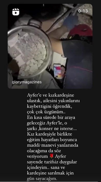Enkaz altında kalan kız kardeşlere Çanakkaleli şarkıcı Zeynep Bastık ulaştı. Ailesini ve yakınlarını kaybeden Ayfer ve Fatma ile en kısa sürede bir araya geleceklerini söyleyen Bastık, eğitim hayatları boyunca maddi ve manevi olarak yanlarında olacağını açıkladı. Tarifsiz duygular içinde olduğunu söyleyen Zeynep Bastık, "Sana ve kız kardeşine sarılmak için gün sayacağım" dedi.