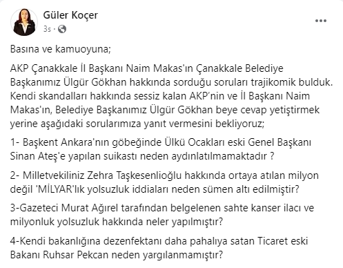 AK Parti Çanakkale il Başkan Naim Makas’ın sosyal medya hesabından yaptığı eleştirilere Ana muhalefet Partisi CHP’nin yeni Çanakkale il Başkanı Sabiha Güler Koçer’den yine Hem partisinin hem de kendi sosyal medya üzerinden cevap verdi. Koçer, paylaşımında önce Türkiye geneli ardından da yerel gündemi ilgilendiren soruları yönelterek “AKP Çanakkale İl Başkanı Naim Makas'ın Çanakkale Belediye Başkanımız Ülgür Gökhan hakkında sorduğu soruları trajikomik bulduk. Kendi skandalları hakkında sessiz kalan AKP’nin ve İl Başkanı Naim Makas'ın, Belediye Başkanımız Ülgür Gökhan beye cevap yetiştirmek yerine aşağıdaki sorularımıza yanıt vermesini bekliyoruz; Başkent Ankara'nın göbeğinde Ülkü Ocakları eski Genel Başkanı Sinan Ateş'e yapılan suikastı neden aydınlatılmamaktadır ?, Milletvekiliniz Zehra Taşkesenlioğlu hakkında ortaya atılan milyon değil “MİLYAR” lık yolsuzluk iddiaları neden sümen altı edilmiştir?, Gazeteci Murat Ağırel tarafından belgelenen sahte kanser ilacı ve milyonluk yolsuzluk hakkında neler yapılmıştır?, Kendi bakanlığına dezenfektanı daha pahalıya satan Ticaret eski Bakanı Ruhsar Pekcan neden yargılanmamıştır?, Genel Başkanımız Sayın Kemal Kılıçdaroğlu' nun kuruşu kuruşuna hesaplattığı ve halkımızdan çalındığını açıkladığı 418 milyar dolar nerededir?, AKP’li Şirin Ünal’ın evinde çalışan ve ölü bulunan Özbek Nadira Kadirova dosyası neden sümen altı edilmiştir?, Tekirdağ Çorlu'da 4 yıl önce 25 kişinin hayatını kaybettiği tren kazasında hiçbir tutuklunun olmaması içinizi hiç acıtmadı mı?, TBMM'de bir suç örgütü liderinden aylık 10 bin dolar alan milletvekili bulunduğu iddiası İçişleri Bakanı tarafından ifade edildi ve bu hususta hukuki neden tek bir işlem yapılmadı?”