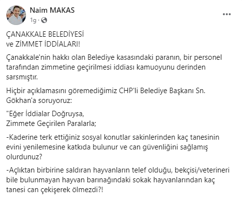 Seçim yaklaşıyor siyasi arena kızışıyor. Genel seçimlerin 14 Mayıs’ta yapılacağının neredeyse kesinleşmesinin ardından siyasilerde seçim atmosferine girdi. Hal böyle olunca da tartışma yada söz düellolarının yeri sosyal medya oldu. Kısa süre önce iktidar partisi olan AK Partinin Çanakkale İl Başkanı Naim Makas hem parti hem de kendine ait sosyal medya hesabından “Çanakkale Belediyesi ve Zimmet İddiaları!” başlığı ile yazı paylaştı. Makas paylaşımında şu cümlelere yer verdi. “Çanakkale'nin hakkı olan Belediye kasasındaki paranın, bir personel tarafından zimmetine geçirilmesi iddiası kamuoyunu derinden sarsmıştır. Hiçbir açıklamasını göremediğimiz CHP'li Belediye Başkanı Sn. Gökhan'a soruyoruz: "Eğer İddialar Doğruysa, Zimmete Geçirilen Paralarla; Kaderine terk ettiğiniz sosyal konutlar sakinlerinden kaç tanesinin evini yenilemesine katkıda bulunur ve can güvenliğini sağlamış olurdunuz?, Açlıktan birbirine saldıran hayvanların telef olduğu, bekçisi/veterineri bile bulunmayan hayvan barınağındaki sokak hayvanlarından kaç tanesi can çekişerek ölmezdi?! Suya ve ulaşıma yapılan zamların aksine bu hizmetlere hangi oranda indirim yapabilirdiniz? Mezarlıklara yapılan zammı çok gören vatandaşa "ölmeyin o zaman kardeşim" diyebilen Belediye Başkanı olarak, dar gelirli kaç aileye ücretsiz mezarlık tahsis edebilirdiniz?" Eğer bu iddialar doğruysa, Sn. Gökhan acaba bu soruların cevabını düşündüğünde rahat uyuyabilecek mi, bunu değerli kamuoyunun takdirine bırakıyor ve Çanakkale halkının konuyla alakalı olarak acilen bilgilendirilmesi gerektiğini kendilerine hatırlatmak istiyoruz.”