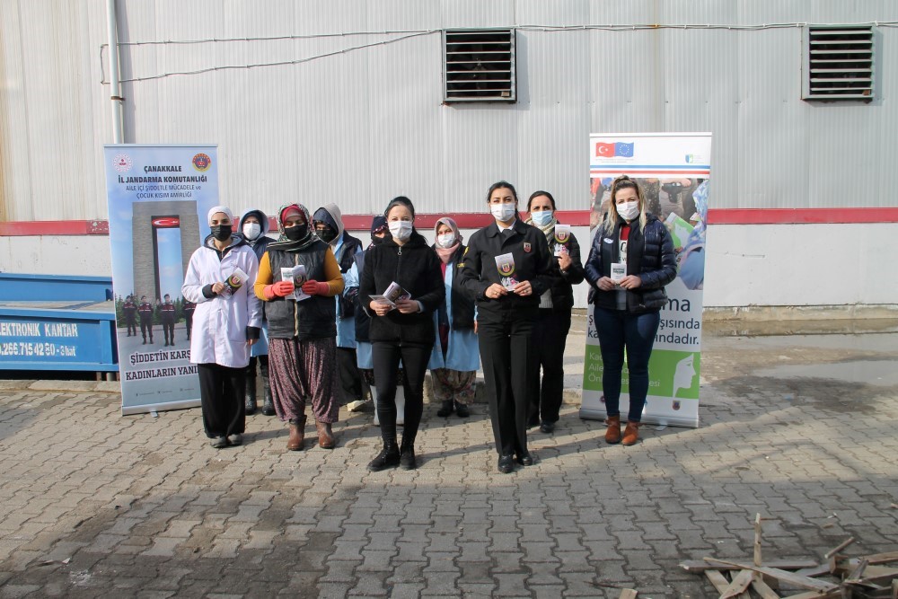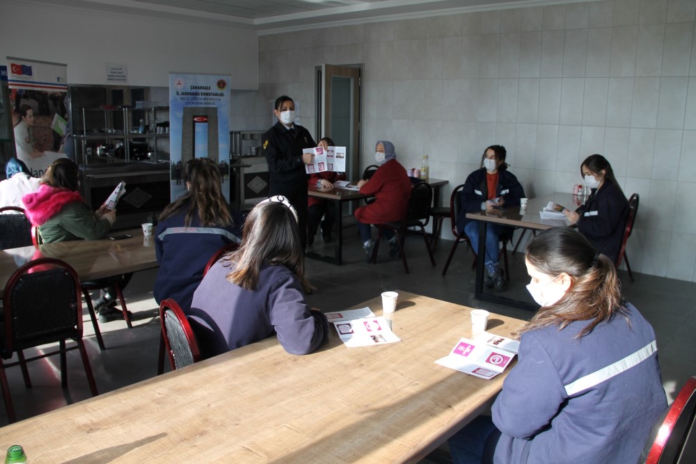 Çanakkale İl Jandarma Komutanlığı Aile İçi Şiddetle Mücadele ve Çocuk Kısım Amirliği tarafından aile içi ve kadına şiddet olaylarının önüne geçilmesi için çalışmalar aralıksız sürüyor. 2021 yılı eğitim planı kapsamında Jandarma; personelin hizmet içi eğitim faaliyetlerinin yanı sıra sorumluluk sahalarında bulunan işletmeler bünyesinde çalışan kadın vatandaşlara KADES (Kadın Destek Uygulaması) uygulamasının tanıtımını yaparak, kadınları 6284 sayılı Ailenin Korunması ve Kadına Karşı Şiddetin Önlenmesi Kanunu hakkında bilgilendiriliyor. Şiddete maruz kalan kadınların tedbir kararlarından nasıl yararlanabilecekleri ve şiddete uğradıklarında nerelere başvuru yapabilecekleri konusunda bilgilendirme yapan Jandarma ekipleri Ocak ayında; Eceabat (AFY Gıda Ürünleri), Gelibolu (Saros Tekstil Fabrikası), Biga (Royal Foods Turşu Fabrikası, Fumar Tütün Mamulleri Tesisi, Golteks Petrol ve Kimya Sanayi), Lapseki (Ulubay Soğuk Hava Deposu, Tümad Altın Madeni) ilçelerindeki işletmeleri ziyaret ederek toplam 226 kadın vatandaşa ulaştı. Aile İçi Şiddetle Mücadele ve Çocuk Kısım Amirliği her ay ilçe ziyaretlerine devam ederek Jandarma sorumluluk sahasındaki tüm kadınlara ulaşmayı hedefleniyor.