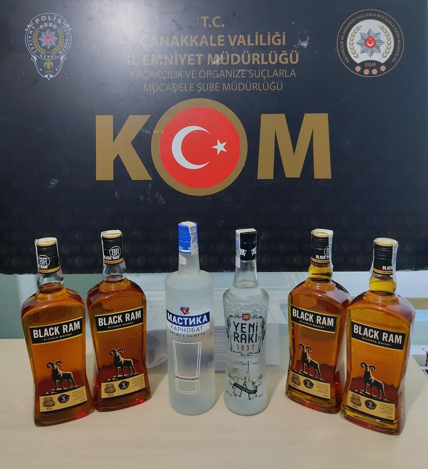 Çanakkale Emniyet Müdürlüğü, Kaçakçılık ve Organize Suçlarla Mücadele Şube Müdürlüğü tarafından Çanakkale’nin ilçelerinde Kaçakçılık Suçlarının Önlenmesine yönelik olarak Gelibolu İlçemiz Bölge Trafik Karşısı Yol Uygulaması çalışmalarımız neticesinde;  R.M. isimli şahsın kullanımımda bulunan araç içerisinde yapılan aramada çeşitli markalarda; Toplamda 16 adet Bulgaristan ülkesine ait bandrollü alkollü içkiler bulundu. Bulunan alkollü içkilere  mahkeme kararı gereği el konuldu. Şüpheli R.M. isimli şahsa 5607 SKM suçundan adli işlem yapıldı. Şahıs savcılık talimatıyla Gelibolu İlçe Emniyet Müdürlüğünden serbest bırakıldı.