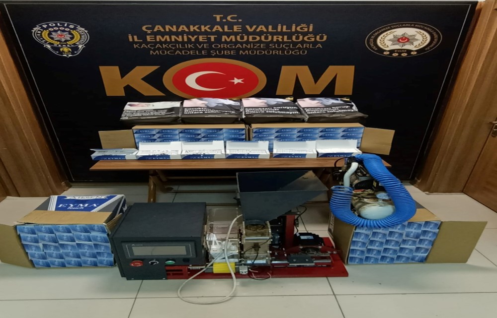 Çanakkale Emniyet Müdürlüğü, Çanakkale’de İlimiz Kaçakçılık Suçlarıyla Mücadele kapsamında, yapılan çalışmalarda; B.K,İ.N,İ.Ç isimli şahısların deposunda yapılan arama sonucunda 1 adet digital sigara sarma makinası ve 1 adet hava kompresörü, 12.200 adet doldurulmuş sigara, Üzerlerinde bandrol bulunmayan 11.600 adet boş makaron, Üzerlerinde bandrol bulunan 20.000 adet boş makaron, Üzerlerinde bandrol bulunan toplam 19 kilo kıyılmış tütün ele geçirildi. Ele geçirilen tüm alet ve mallara el konuldu. Şüpheli B.K,İ.N,İ.Ç isimli şahıslar hakkında 5607 SKM suçundan adli işlem yapıldı şahır savcılık talimatıyla seşbest bırakıldı.