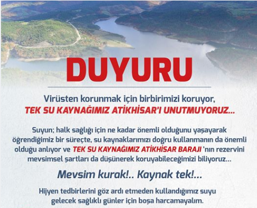 Tüm bu açıklamaların ardından Çanakkale Belediyesi de Sosyal medya hesaplarından Atikhisar Barajı su seviyesinin olması gerekenden çok daha düşük olduğunu belirtmek ve tehlikeye dikkat çekmek için sosyal medya hesaplarından çok önemli bir paylaşım gerçekleştirdi. “ Virüsten Korunmak İçin Birbirimizi Koruyor, Tek Su Kaynağımız Atihhisar’ı Umutmuyoruz” bağlığı ile yapılan paylaşım yaptı. Bu uyarıya “Unutmuyoruz, Mevsim Kurak, Kaynak Tek Hijyen Tedbirlerini Göz Ardı Etmeden Kullandığımız Suyu Gelecek Sağlıklı Günler İçin Boşa Harcamayalım…” paylaşımı yaparak hayatımız devem ettirebilmek ve Coronavirüse karşı hijyen sağlayabilmek adına tüm alanlarda kullandığımız suyu boşa harcamayarak tasarruf yapılması gerektiği konusunda Çanakkalelilere uyarı yapıldı.