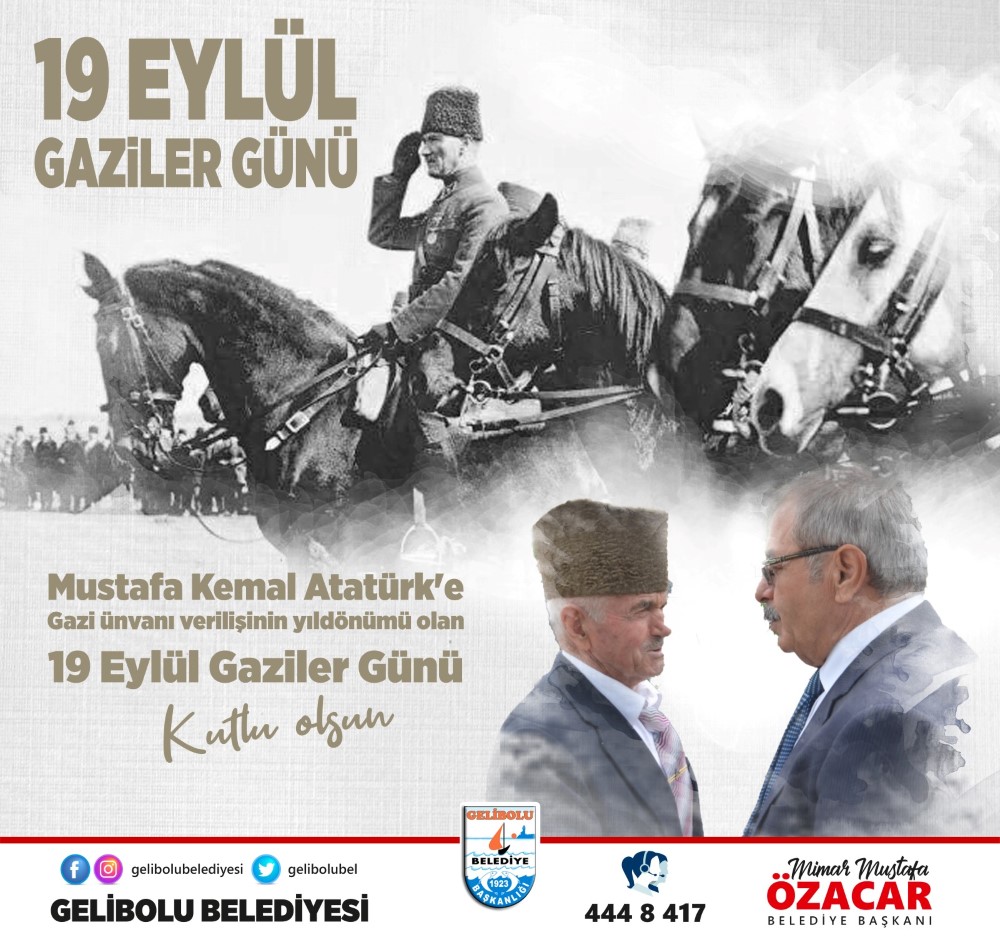 Gelibolu Belediye Başkanı Özacar, Millet Meclisi tarafından Büyük Önder Mustafa Kemal Atatürk’e, 19 Eylül 1921′de “Mareşal” rütbesi ile “Gazi” unvanı verilişinin 99.Yıldönümü ve tam bağımsız özgür bir Türkiye için, uğruna canlarını hiç çekinmeden ortaya koyan gazileri minnet ve şükranla andıklarını belirterek, 19 Eylül Gaziler Günü dolayısıyla yazılı bir mesaj yayınladı.Başkan Özacar, mesajında şu ifadeleri kullandı: “Ulu Önderimiz Mustafa Kemal Atatürk’e, Sakarya Savaşı’nın ardından TBMM tarafından Gazilik ve Mareşallik unvanın verilmesi ile her yıl 19 Eylül Gaziler Günü olarak kutlanmaktadır. Gazilerimiz ve ülkemiz için özel bir günde, özgürlük için birlik ve beraberliğimiz için mücadele eden gazilerimiz, bizlerin gönlünde eşsiz, saygın ve özel bir yer tutmaktadırlar. Gazilerimizi ilgilendiren yasal hususların daha da iyileştirilmesini, kendilerine layık yaşam standartlarının oluşturulmasını diliyor ve bekliyoruz. Bu vesileyle başta Ulu Önder Gazi Mustafa Kemal Atatürk ve silah arkadaşları olmak üzere, şehitlerimizi ve ebediyete intikal etmiş gazilerimizi rahmetle anıyor, hayatta olan gazilerimize esenlik ve huzurlu dolu bir ömür diliyor, minnet ve şükranlarını sunuyoruz.”