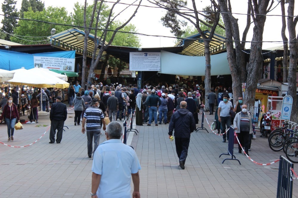 Çanakkale’de Coronavirüs tedbirleri kapsamında bu gece yarısından itibaren başlayacak olan sokağa çıkma kısıtlaması bayram arifesinde kurulacak olan para yoğun bir talep beklenmesinden dolayı Çanakkale İl hıfzıssıhha kurulunun aldığı karar gereğince Cuma Pazarı alanında Perşembe günüde Pazar kurulmasına karar verilmişti. Karar Cuma günü kurulacak halk pazarında yaşanacak bir yoğunluğun önüne geçmekti. Perşembe günüde Cuma Pazarı alanında kurulan halk pazarından çok sayıda Çanakkaleli faydalanarak bayram alışverişlerini ve mutfak eksikliklerini giderdi. Arife günü öncesinde bugün kurulan Cuma Pazarında ise sabah saatlerinde yoğunluk yaşanmadı. Ancak saatler ilerledikçe Cuma Pazarına kontrollü giriş - çıkış yapılan noktalarda yoğunluk yaşanmaya başladı. Bir süre önce giyim ve hırdavat reyonlarının da Pazar alanındaki yerlerini alması da Ramazan Bayramı öncesi vatandaşların özelliklede bayanların Pazar alandaki kalış sürelerini çok uzattı. Bu kalış süresinin uzaması nedeni ile Cuma Pazarına giriş yapılan 4 noktada kuyruklar oluştu. Giriş noktalarından, Emniyet kuvvetleri ve Çanakkale Belediyesi Zabıta Müdürlüğü ekipleri kontrollü bir şekilde Pazar alana girişe izin verseler bile Cuma pazarı alanında saatler geçtikçe yoğunluk armaya başladı. Giyim reyonları ile sebze ve meyve reyonları ve süt ürünlerinin satışının yapıldığı reyonlarda önemli yoğunluklar oluştu. Oluşan yoğunluklar nedeni ile “Sosyal Mesafe” kuralıda unutuldu. Vatandaşlar Ramazan Bayramı nedeni ile sokağa çıkma yasağını süresini evde geçireceklerinden dolayı yoğun bir alışveriş telaşına düşerken sosyal mesafede Ramazan Bayramı alışverişlerine yenik düşmüş oldu.