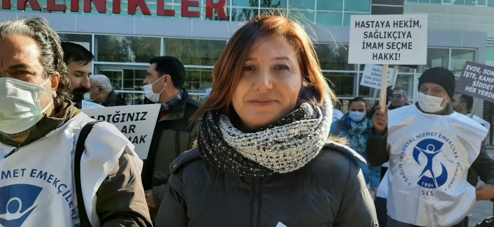 Sağlık ve Sosyal Hizmet Emekçileri Sendikası (SES) Çanakkale Şubesi, Çanakkale Tabip Odası ve Çanakkale Diş Hekimleri Odası üyeleri Çanakkale Onsekiz Mart Üniversitesi Sağlık uygulamaları ve Araştırma Hastanesi poliklinik girişi önünde “Kadına ve Sağlık Emekçilerine Yönelik Her Türlü Şiddeti Durduralım!” konulu basın açıklaması için toplantı. Sendika ve oda üyeleri elinde “ Bu İşyerinde Cinayet Tehlikesi var”, “Şiddeti Besleyen Politikalar Bizleri Öldürüyor”, “ Sağlıkta Her yer Suç, Her Yer Cinayet Mahalli”, Kadına Şiddet En Ağır suçtur” yazılı dövizler ile basın açıklamasına katıldılar. Basın açıklamasının ilk bölümünü SES Kadın sekreteri Saadet Yılmaz yaptı. Yılmaz açıklamasında “kadına yönelik şiddetin failleri cezalandırmıyor! Kadına yönelik şiddet teşvik ediyor” dedi. Yılmaz açıklamasında şunları söyledi. “Sözün bittiği yerdeyiz! Tahammülümüz kalmadı! Nefes alamıyoruz! Tükendik! Güvenli ortamlarda çalışmıyor, her an şiddet tehdidi altında, inanılmaz bir stresle yaşıyoruz. Kadına ve sağlık emekçilerine yönelik şiddet her gün, her dakika artıyor. Şiddet pandemisi ile karşı karşıyayız. Artık bir meslektaşımızın dahi kılına zarar gelmesini istemiyoruz. Bir şiddet failinin daha serbest bırakıldığını, bir suçun daha cezasız kaldığını görmek istemiyoruz. Yönetenlerin ölüm sessizliğine tahammülümüz kalmadı. Ölüyoruz! Hal böyleyken çalışamıyoruz. Bırakın çalışmayı nefes dahi alamıyoruz. Daha yeni, İstanbul Kartal’da bir Aile Sağlığı Merkezi’nde çalışan hemşire arkadaşımız silahlı saldırıya uğradı ve hayatını kaybetti. Bu ülke kadınları korumuyor! Kadınlar her gün tanıdığı ya da tanımadığı erkeklerin şiddetine maruz kalıyor. Şikayetçi olduklarında, hayatları için koruma istediklerinde bile yalnız bırakılıyor. İktidar şiddeti önlemek ve kadın kazanımlarını geliştirmek yerine, kadın düşmanı politikaları sürdürüyor. İktidarın cezasızlık politikalarından cesaret alan erkekler, her gün en az 3 kadını katlediyor. Bu ülke kadına yönelik şiddet faillerini cezalandırmıyor! Kadına yönelik şiddeti teşvik ediyor! Her bir cezasızlık haberi, bir sonraki potansiyel faili cesaretlendiriyor. Ömür Erez’i yalnızca faili değil, İstanbul Sözleşmesi’ni feshedenler, tacize, tecavüze, istismara, kadın katliamlarına, LGBTİ bireylere yönelik nefret söylemleri geliştirenler de katletti. Cinsiyet eşitsizliğini savunan siyasetçiler, erkek yargı, kadın düşmanı politikalar da katletti.