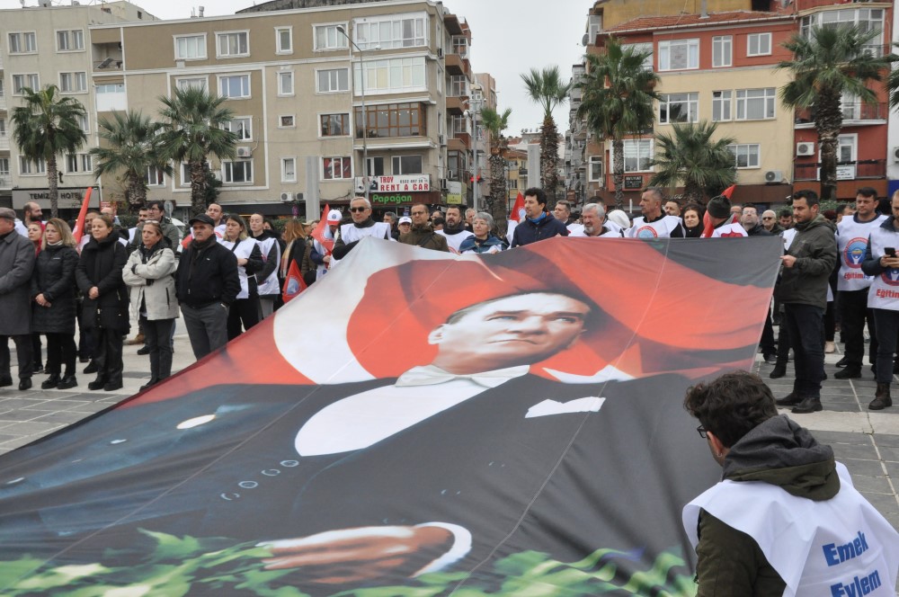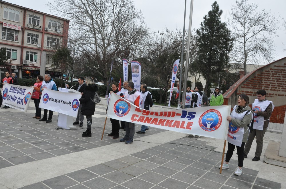 Birleşik Kamu İş Konfederasyonu tüm Türkiye’de eş zamanlı olarak memur ve memur emeklilerine yapılan zammı protesto etti Protestoların Çanakkale’deki Adresi Cumhuriyet Meydanı oldu. Protestoda Eğitim-İş Sendikası Çanakkale Şube Başkanı Serkan Serbes yaptığı açıklamada ‘’Emekli dostlarımız, halkımız ve emeği ile geçinen değerli kamu çalışanlarımız, Yanlış ekonomi politikaları, halkı değil rantı düşünerek alınan kararlarla ülkeyi derin bir ekonomik krizin ortasına getiren siyasi iktidar, açıkladığı trajik zam oranıyla kamu emekçisini sefalete terk ettiğini resmiyete kavuşturmuştur. Tarafsız ve şeffaf bir devlet kurumundan çok iktidarın rakamlarla oynama şirketi gibi çalışan TÜİK in, marketlerdeki etiketlerin her gece değiştiği bu ağır enflasyon ortamında, son 6 ayın enflasyonunu yüzde 15 olarak açıklamasıyla başlayan tiyatro, bu gerçekdışı rakam baz alınarak kamu emekçisine ve emekliye, adına zam bile denemeyecek bir ücret artışının reva görülmesiyle son bulmuştur. Bir “müjde” olarak duyurulan yüzde 30’luk ücret artışı kelimenin tam anlamıyla emeğimize hakaret, gerçeklere ihanettir. Motorlu taşıtlar vergisi ile emlak vergisinin yüzde 61; birçok ceza ve vergiyi belirleyen “Yeniden Değerleme Oram” yüzde 123 artmışken ağır bir geçim sıkıntısı içindeki kamu emekçisine verilen yüzde 30 ücret artışına “müjde” diyebilmek için gerçeklikten kopmak gereklidir.’’ ifadelerine yer verdi.