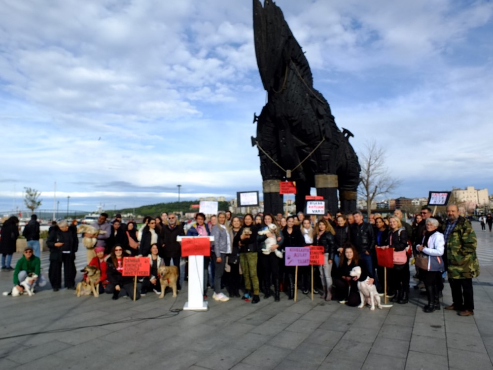 Çanakkale’de gerçekleşen "81 İl Sokak Hayvanları İçin Tek Ses Tek Yürek" basın açıklaması Mor Pati Derneği Çanakkale Organizasyonu ile gerçekleşti. Truva Atı önünde gerçekleştirilen basın açıklamasında başta sokak hayvanları olmak üzere hayvanlara yönelik şiddetin sona ermesi ve sokak hayvanlarının tutulduğu barınaklardaki şartların iyileştirilmesi talep edildi. Çanakkale’de gerçekleştirilen Basın açıklamasını hayvan severler adına Arzu Sezek Okudu. Sezek, açıklamada “Bu gün bir Müslüman ülkeye, bir uygar ülkeye ve bir hukuk devletine yakışmayacak biçimde merhamet, sevgi ve insanlık duyguları taşlaşmış yüreklerini terk etmiş adeta cinnet geçiren küçük bir azınlık olan kanlı bir şer çetesi zavallı sokak köpeklerine Toplatılıp Öldürülsünler diye savaş açmış durumda. Ne yazık ki bu kanlı şer odakları ‘Devlet bizim arkamızda’ diye cüretkarca açıklamalar yapabilecek kadar gözlerini kan bürümüş durumdalar. Devletin ilgili kurumları ise, sokak hayvanları sorununun tek sebebi bakımevi kurmayan kısırlaştırma yapmayan belediyeler olmasına rağmen, bazı siyasilerin ve odakların etkisi ile hedefe hayvanların toplatılması ve öldürülmesini koymaya devam ediyor” dedi.