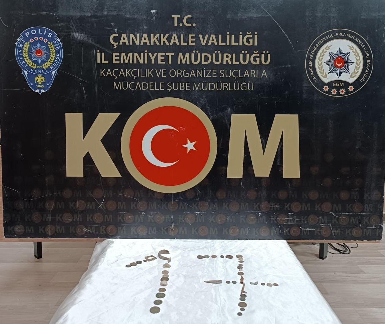 Çanakkale Emniyet Müdürlüğü KOM Şube Müdürlüğü Kaçakçılık Suçları Büro Amirliği görevlileri Çanakkale’de Tarihi Eser Kaçakçılığına yönelik olarak yapılan çalışmalar neticesinde H.B isimli şahsın ikametinde yapılan arama neticesinde toplamda;41 (Kırkbir) adet tarihi eser niteliğinde olduğu değerlendirilen metal objelere el konuldu. Şüpheli H.B isimli şahıs hakkında 2863 SKM suçundan adli işlem yapıldı olup, Şahıs savcılık talimatıyla Şube Müdürlüğünden serbest bırakıldı