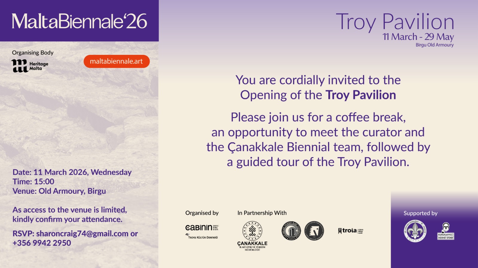 Çanakkale Bienali tarafından 2. Malta Bienali’nin resmi programı kapsamında hayata geçirilen Troya Pavyonu, 11-13 Mart 2026 tarihleri arasındaki ön gösterimin ardından 14 Mart itibarıyla ziyarete açılıyor. Sergi, 29 Mayıs 2026 tarihine kadar Malta’nın tarihi mekânlarından Old Armoury Birgu’da uluslararası sanat izleyicisini ağırlayacak. Küratörlüğünü Deniz Erbaş’ın üstlendiği sergi, sanatçıların Çanakkale’de ürettiği çalışmaları bir araya getirerek Troya’yı yalnızca arkeolojik ve mitolojik bir değer olarak değil, Akdeniz coğrafyasının güncel sanatsal ve düşünsel üretimleri için yaşayan bir referans noktası olarak konumlandırıyor.