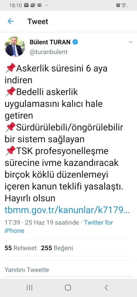 Adalet ve Kalkınma Partisi Grup Başkanvekili ve Çanakkale Milletvekili Bülent turan 23 Haziran seçimleri öncesinde ertelenen ve askerlik süresini 6 aya indiren, bedelli askerliği kalıcı hale getiren kanun teklifinin kabul edildiğini duyurdu. Turan sosyal medya hesabındaki paylaşımında
