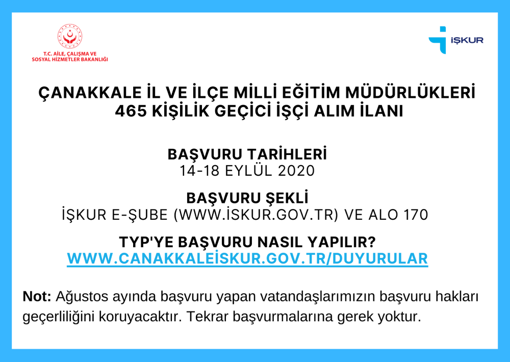 Çanakkale Çalışma ve İş Kurumu İl Müdürlüğü tarafından Toplum Yararına Program kapsamında Çanakkale İl Milli Eğitim ve İlçe Milli Eğitim Müdürlükleri için 400 Temizlik Görevlisi ve 65 Güvenlik Elemanı olmak üzere toplamda 465 geçici personel alınacak. Başvurular 14 – 18 Eylül tarihleri arasında İŞKUR E-Şube üzerinden ve Alo 170 üzerinden yapılacak. 12 Ağustos 2020 tarihinde okulların açılışı ertelenmesi kararından dolayı durdurulan ilana başvuru yapan vatandaşların başvuru hakları geçerliliğini koruyacak. Yapılacak alım hakkında açıklamada bulunan Çanakkale Çalışma ve İş Kurumu İl Müdürü Ali Çalışkan: ‘‘İl Milli Eğitim Müdürlüğümüzün kanaatleri ve okullarımızın ihtiyaçları doğrultusunda Çanakkalemiz adına açılan 465 kişilik kadronun dağılımı gerçekleştirilecek. Geçtiğimiz ay Milli Eğitim Bakanlığımızın aldığı karar doğrultusunda Kurumumuz da bu doğrultuda başvuruları durdurma kararı almıştı. 14 Eylül Pazartesi gününden itibaren yeniden başvuruyu almaya başlıyoruz. Bu ilana daha önce başvuru yapan vatandaşlarımızın başvuruları geçerli olacak, tekrar başvuru yapmalarına gerek kalmayacaktır. Mart ayından beri ülkemiz genelinde devletimizin tüm kurumları, toplumumuzun tüm paydaşları ile birlikte salgına karşı yürüttüğümüz çalışmaları engellememek ve bulaş riskini arttırmamak adına vatandaşlarımızın başvuru için İŞKUR E-Şube ve Alo 170 kanallarını kullanmaları gerekmektedir.’’ dedi. Programa başvuru yapacak adaylarda; Kuruma kayıtlı işsiz olmak, 18 yaşını tamamlamış olmak, başvuru tarihinden önceki son bir aylık sürede sigortalı çalışan ve vergi mükellefi olmamak, emekli, malul aylığı almıyor olmak, Çanakkale il genelinde ikamet ediyor olmak, Öğrenci olmamak (Açık Öğretim Üniversitesi ve Açık Lise öğrencileri hariç) şartları aranacak. Başvuru yapmak isteyen kişiler www.canakkaleiskur.gov.tr adresi Duyurular bölümündeki “TYP’ye başvuru Nasıl Yapılır?” sayfasından İŞKUR E-Şube üzerinden nasıl başvuru yapacaklarını ayrıntılı olarak öğrenebilecekler. Ayrıca 2019 yılında getirilen düzenleme ile TYP katılımcı seçiminde hakkaniyetin ve toplumsal huzurun sağlanması adına ‘‘TYP’lere Adrese Dayalı Nüfus Kayıt Sistemine göre (ADNKS) aynı adreste ikamet eden kişilerden yalnızca birinin katılabileceği’’ ve ‘’ADNKS’ye göre aynı adreste oturanların, gelir getirici bir işte çalışma sonucu elde ettikleri toplam kazançlarının net asgari ücretin bir buçuk katını aşması halinde söz konusu adreste oturan kişilerin TYP’ye katılamayacağı’’ belirtildi. Noter kurasının 22-23 Eylül tarihleri arasında çekileceği, asil seçilen kişilerin 27.09.2017 tarihinden itibaren Toplum Yararı Program kapsamında en fazla 24 ay yararlanabileceği belirtildi.