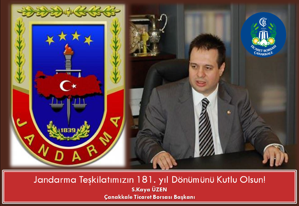 Çanakkale Ticaret Borsası Yönetim Kurulu Başkanı Kaya Üzen Jandarma Genel Komutanlığının kuruluşunun 181. Kuruluş Yıldönümü nedeni ile mesaj yayımladı.Üzen mesajında şu cümlelere yer verdi.