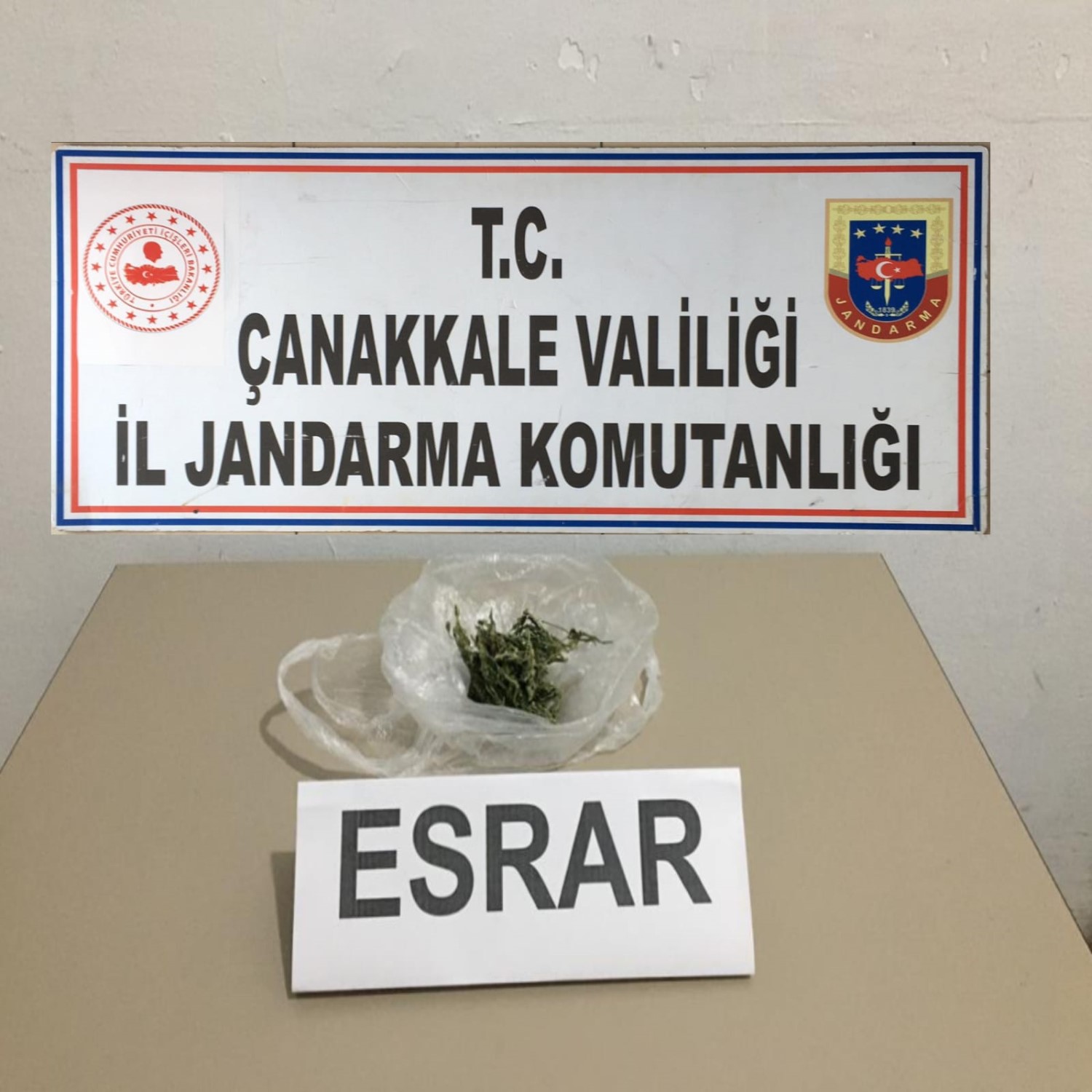 Çanakkale İl jandarma Komutanlığı KOM Şube Müdürlüğü ve Merkez İlçe Jandarma Komutalığınca yapılan istihbahrat çalışmaları neticesinde, içerisinde uyuşturucu madde olduğu bilgisi elde edilen 17 .. ..04 plakalı araç durdurularak yapılan aramada, araç içerisinde bulunan A.S. İsimli şahsın üzerinde şeffaf poşet içerisinde 25 gr. Esrar maddesi ele geçirildi. Çanakkale Nöbetçi Cumhuriyet Savcısının talimatıyla gözaltına alınan A.S. isimli şahıs, sevk edildiği Sulh Ceza Hakimliğince tutuklanarak Çanakkale Kapalı Ceza İnfaz Kurumuna konuldu.