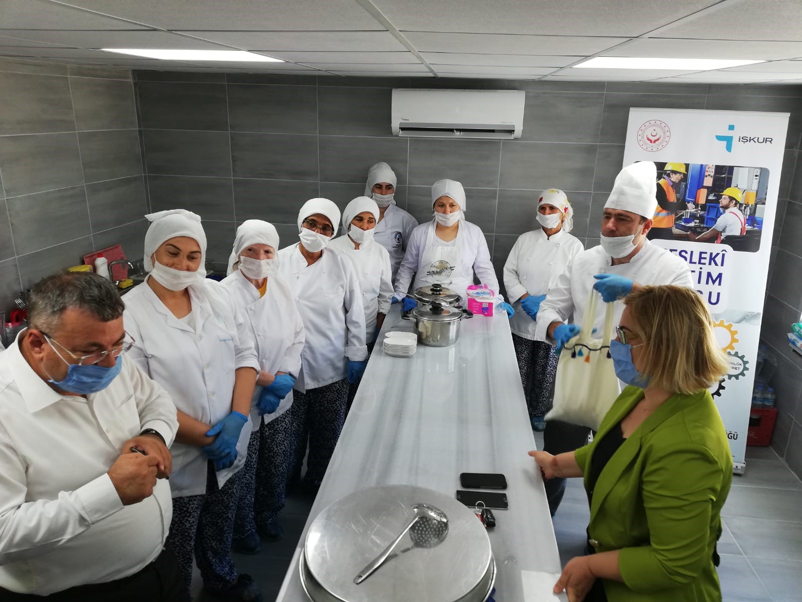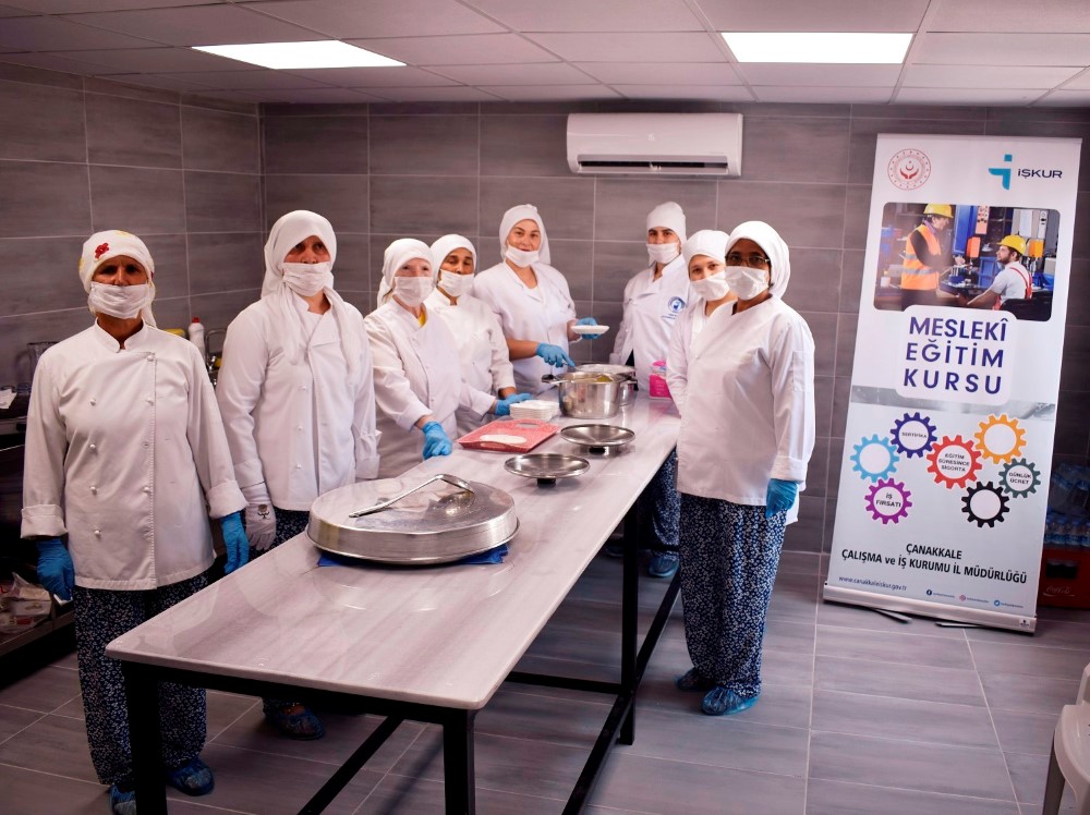 Ziyarette Çanakkale İŞKUR İl Müdürü Ali Çalışkan, Şube Müdürü Ayça Çakmak ve Kurslar Servisi Şefi Aysel Eskici; 8’i kadın 9 katılımcıdan oluşan meslek kursundaki kursiyerler ve kurs sorumluları ile bir araya geldi. Katılımcılarla görüş alışverişinde bulunan ve eğitim sorumlusu Aşçı Hasan Sargın’dan program hakkında bilgi alan Çanakkale İŞKUR İl Müdürü Ali Çalışkan: ‘’Toplum sağlığı açısından uyum sağlamak zorunda olduğumuz ‘Yeni Normal Hayat’ta meslek kurslarımızı açmaya devam ediyor, kurumumuzun tüm faaliyetleriyle çalışmaya özen gösteriyoruz. Bu kursumuzda katılımcılarımız 40 gün boyunca yufka, mantı, erişte, kuşburnu marmelatı, turşu ve pekmez gibi yöresel lezzetlerimizin üretimini öğrenecekler. Bu öğrenimin yanı sıra işletme ve üretilen gıdanın hijyeni, gıda güvenliği ve standartları, ürünlerin ambalajlanması ve depolanmasında da bilgi sahibi olacaklar. Çoğunluğu kadından oluşan katılımcılarımız kurs sonunda yöresel lezzetlerin yapımından nihai tüketiciye ulaştırılması noktasında uzmanlaşacak ve ben inanıyorum ki bu kursumuz sonunda arkadaşlarımız kendi işlerini kurmak için adım atacaklar. Şimdiden bizi bu inanca taşıyan Halk Eğitim Merkezimiz yetkililerine, emek veren hocamıza, İl Müdürlüğümüzdeki çalışma arkadaşlarıma ve emeğin sahipleri kadınlarımıza teşekkür ediyorum.’’ açıklamasında bulundu. Kursiyerlerin günlük 40 lira cep harçlıkları, Genel Sağlık Sigortası, iş kazası ve meslek hastalığı sigortaları program süresince İŞKUR tarafından karşılanacağı belirtildi.
