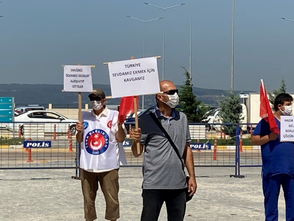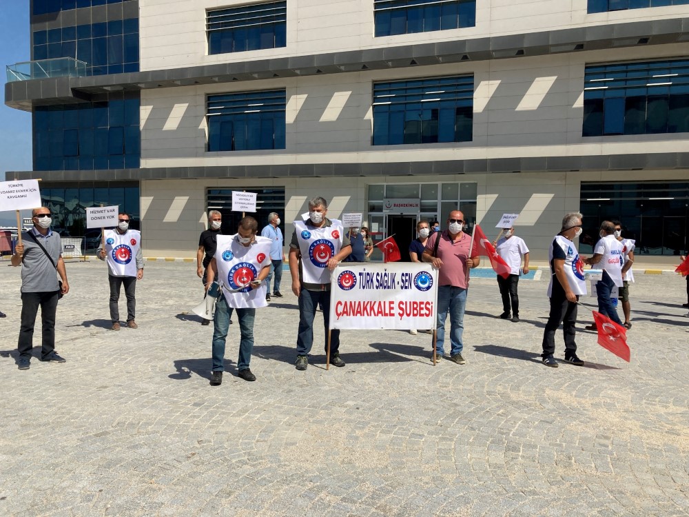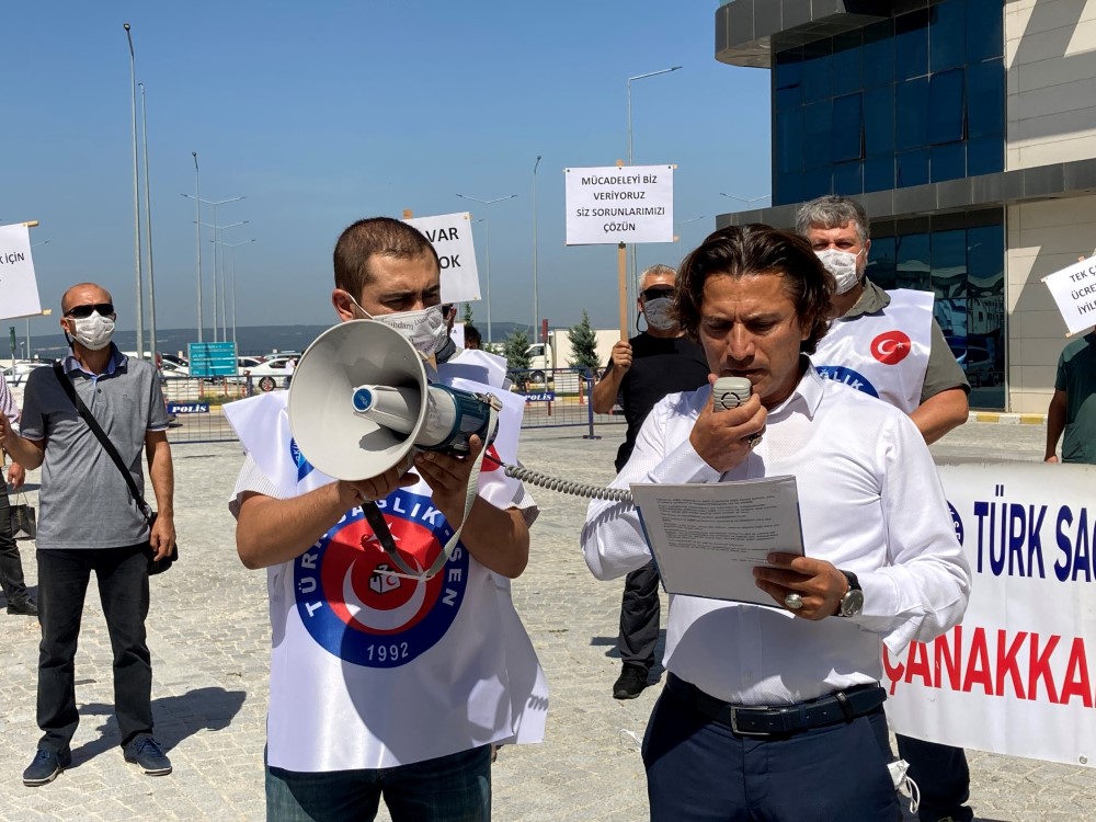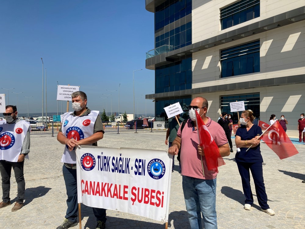 Mehmet Akif Ersoy Devlet hastanesinde görev yapan Türk Sağlık Sen üyeleri hastane bahçesinde eylem düzenledi. Ellerinde Türk Eğitim Sen Çanakkale Şubesine ait pankart ile hastane ön alanına çıkan sendika üyeleri ellerinde “Türkiye Sevdamız, Ekmek İçin Kavgamız”,” Hizmet Var Döner Yok”, “Mücadeleyi Biz Veriyoruz, Sorunları Siz Çözün” yazılı dövizler ile mesaj verdiler. Sağlık Çalışanlarının sorunları ile ilgili açıklama yapan Türk Sağlık Sen Çanakkale Şube Başkanı Turhan Çavdar, Türkiye’nin ilk vakanın görüldüğü 11 Mart’ tan buyana Coronavirüs salgını ile mücadele ettiğini ve bu sürecinde kahramanlarının sağlık çalışanları olduğu u ifade etti. Çavdar Sağlık Çalışanlarının Tüm Zorluklara Rağmen görevlerini fazlasıyla yerine getirdiklerini ifade ederek “11 Marttan bu yana Türkiye salgınla mücadele ediyor. Sağlık Bakanlığı bu mücadelenin kurumu olarak bugüne kadar yaptıkları ile hep takdir topladı. Sayın Bakan Bilim Kurulu, günlük açıklamalar ve tedbirler konusunda başarılı bir yönetim performansı ortaya koydu. Hiç şüphesiz ki salgınla mücadelenin kahramanları da sağlık çalışanları oldu. Tüm zorluklara rağmen olağanüstü bir çalışma azmi, kendi hayatlarını hiçe sayarak gösterdikleri fedakarlık, ailelerinden aylarca uzak kalarak yaptıkları hizmetle tarihe geçtiler. Binlerce arkadaşımız virüse yakalandı, hayatını kaybederek şehit olanlar oldu. Bugün bir kez daha şehitlerimize Allah'tan rahmet, hasta olan tüm arkadaşlarımıza da acil şifalar diliyorum. Salgının ortaya çıktığı ilk günden beri süreç çok kritik olduğu için bizde oldukça hassas davrandık. Sağlık hizmetlerinin sıkıntıya girmemesi, sağlık çalışanlarının sağlığının korunması adına uyarılarda ve önerilerde bulunduk. İlerleyen süreçte sağlık çalışanlarının alkışlandıklarını, Milletin ve devletin her kademesinden sağlık çalışanlarına teşekkür edilip, takdir edildiklerini hep beraber gördük. Her ne kadar alkışlar ve teşekkürler güzel ise de asıl meselenin sağlık çalışanlarının sorunlarını bitirmekten geçtiğini belirterek temel meselelere çözüm istedik. Çalışanların emeğinin karşılığını ödeyecek bir değer olmadığını ama alın terlerinin de heba edilmemesini ısrarla dile getirdik.” dedi.