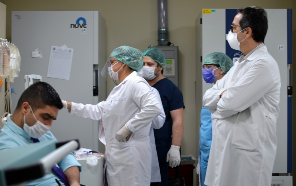 ÇOMÜ Hastanesi’nin açıldığı 2008 tarihinden bu yana hizmet üreten Kan Transfüzyon Birimi, hastaların kan ve ürünleri ihtiyaçlarını modern ve güncel cihazlar ile sağlamaktadır. Birimde sorumlu hekim Doç. Dr. Alper Şener, iki hemşire ve yedi adet laboratuvar teknisyeni ile birlikte toplam 10 kişi görev yapmaktadır. Türkiye’deki diğer transfüzyon birimlerinden farklı olarak, aferez işlemi yapılabilen bir ünitedir. Bu aferez işleminde kullanılan cihaz artık aynı zamanda Covid-19 hastaları için immün plazma hazırlayacak duruma getirilmiştir. 06.05.2020 tarihinden itibaren ÇOMÜ Pandemi Hastanesinde Kan Transfüzyon Biriminde Plazma Tedavisi için bağış alınabilmektedir. Yapılan immün plazma bağışının ardından Doç. Dr. Alper Şener süreçle ilgili şu bilgileri aktardı. “Plazma bağışı normal kan bağışından biraz farklı. Vatandaşlarımız senede üç kereden daha fazla kan bağışında bulunamıyorlar ama plazma bağışı haftada 2 kere verilebiliyor. Çünkü bu işlemi yapan cihaz tıpkı bir diyaliz cihazı mantığıyla çalışıyor, bağışçının kanını alıp sadece plazmaya ayırıyor. Yani hastanın kan değerlerinde herhangi bir değişim meydana gelmiyor. Bu sebeple sık bir şekilde plazma bağışçısı olabilirsiniz bu oldukça güvenilir. Covid-19 hastalığı geçirmiş bağışık hastalardan istediğimiz bu. Özellikle hastalığı atlattıktan sonra 90 ile 180 günlük periyotlar içerisinde antikorların kalitesi bozulmadan olabildiğince fazla plazma bağışı yapılmasını bekliyoruz.”