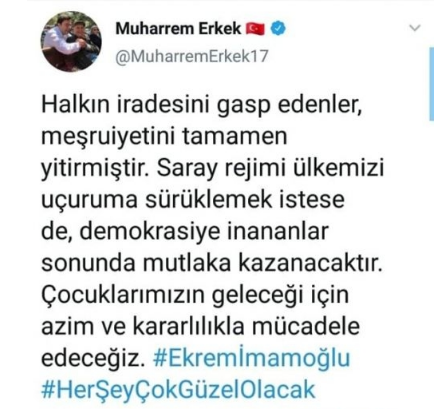 CHP Genel Başkan Yardımcısı, Çanakkale Milletvekili Avukat Muharrem Erkek İstanbul Seçiminin Ysk Tarafından İptal Edilmesinin Ardından Sosyal Medya Hesabından Açıklamalarda Bulundu. CHP Genel Başkan Yardımcısı, Çanakkale Milletvekili Av. Muharrem Erkek İstanbul Seçiminin İptalinin Ardından Twitter Hesabından Yaptığı Paylaşımda; “Halkın İradesini Gasp Edenler Meşruiyetini Tamamen Yitirmiştir. Saray Rejimi Ülkemizi Uçurama Sürüklemek İstese De, Demokrasiye İnananlar Sonunda Mutlaka Kazanacaktır. Çocuklarımızın Geleceği İçin Azim Ve Kararlılıkla Mücadele Edeceğiz” İfadelerini Kullandı.