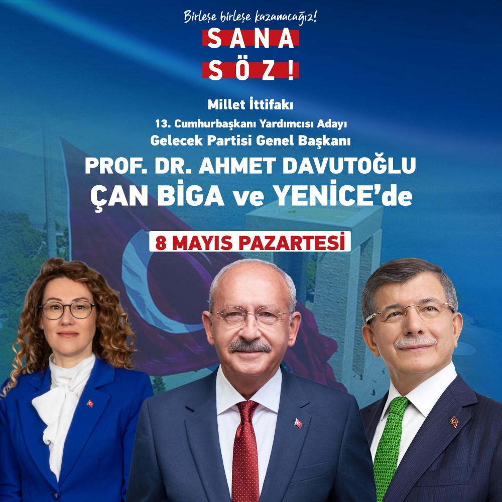 Millet İttifakı Cumhurbaşkanı Yardımcısı Adayı ve Gelecek Partisi Genel Başkanı Prof. Dr. Ahmet Davutoğlu 8 Mayıs Pazartesi günü Çanakkale’ye geliyor.