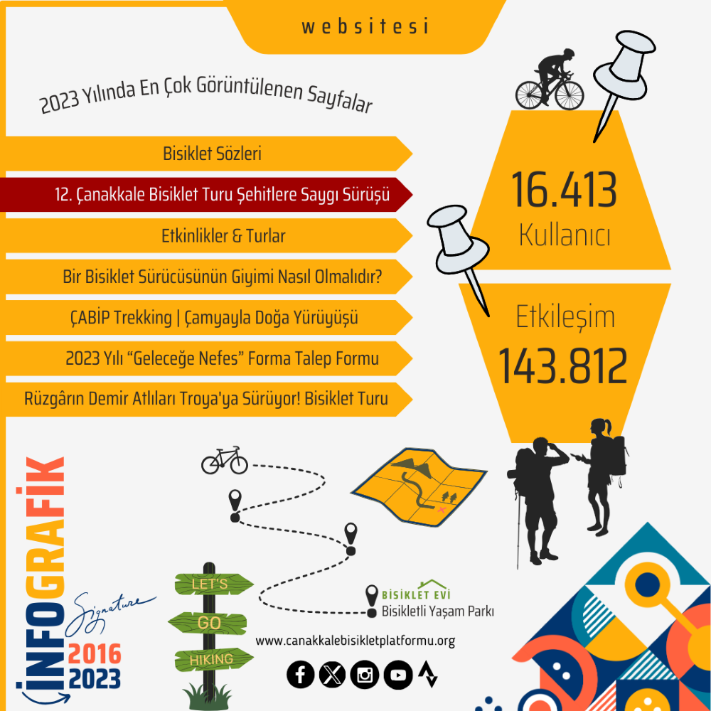 Çanakkale Bisiklet Platformu 17 Ekim 2016 tarihinde Çanakkale’de bisiklet kültürünün yerleşmesini, bisikletli ulaşımı yaygınlaştırmayı, kentte yaşayan tüm bisikletçilerin ortak bir sesi olmasını, kentteki bisiklet gruplarının birlikte çalışabilirliğini, ortak etkinlikler düzenleyebilmesini, şehir içi ulaşımını bisikletle gerçekleştirenlere ve spor-hobi kullanıcılarına daha sağlıklı kullanım alanları oluşturulması için kamu kurumları ile belediye ulaşım politikasında bisiklete önem vermelerini sağlamayı amaçlayarak Kurulan Çanakkale Bisiklet Platformu bir süre önce 7. Kuruluş yıldönümünü kutlamıştı. Çanakkale bisiklet Platformu 2023 yılının son günlerinde Platformun internet sitesi ve sosyal medya sayfaları ile ilgili kuruluğundan buyana gerçekleşen istatistikleri açıkladı. Çanakkale Bisiklet Platformu 2016 – 2023 yılları arasında ve 2023 özelinde gerçekleştirilen sosyal medya, web sitesi, etkinlik istatistiklerini ve gönüllü sayılarının sayısal verilerini paylaştı. Platformun Sosyal medya takipçi sayısı 20.718’e yükseldi. Platformun sosyal medyasında Facebook’ ta 9.798, Instagram’ da 9.029, Linkedin’ de 95 ve Youtube’ de 505 takipçisi bulunuyor. ÇABİP’i internet sitesi ve sosyal medya hesaplarından takip eden takipçilerin yaşadığı şehirler ise başta Çanakkale olmak üzere Ankara, İstanbul, İzmir, Bursa. En takipçi ülkeler ise Türkiye, Almanya, İran ve Hindistan. Takipcilerin %67 Erkek, %33’ü ise kadın. Bu takipçiler ÇABİP’in sosyal medya içeriklerine toplam 263.672 erişim sağladı. Platformun internet sitesinde 2023 yılı en çok görüntülenen haber “12. Çanakkale Bisiklet Turu Şehitlere Saygı sürüşü “ haberini oldu. bu haberi 16.413 takipçi görüntüledi. Platform 2016 – 2023 yılları arasında gerçekleştirdiği etkinliklerde toplam 65 faaliyet gerçekleştirildi. Bu faaliyetler 3.453 katılımcı ile gerçekleştirildi. Faaliyetlerde toplam 1.746 kilometre pedallandı. 52 bisiklet turu, 6 doğa yürüyüşü, organize edildi. Kuruluğundan bugüne ÇABİP’ in gönüllü sayısı 927’ye yükseldi. ÇABİP Trekkıng gönüllülerinin sayısı ise 374 oldu. Sayılardan da anlaşıldığı gibi Çanakkale’nin Bisiklet ve trekkıng buluşma noktası ÇABİP her geçen gün büyümeye devam ediyor.