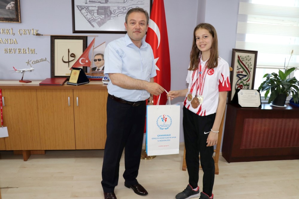 Değişik şampiyonalarda başarı elde eden Taekwondocularımız ve teknik heyet Gençlik ve Spor İl Müdürümüz Aziz Sinan Alp’i makamında ziyaret etti. Başarılı sporcuları tebrik ederek teşvik amaçlı çeşitli hediyeler veren İl Müdürü Alp, sporcularımıza desteklerinin artarak devam edeceğini söyledi. Çanakkale Taekwondo İl Temsilcisi Hasan Altunışık sporcuların değişik şampiyonalarda elde etmiş oldukları başarıları şöyle değerlendirdi: