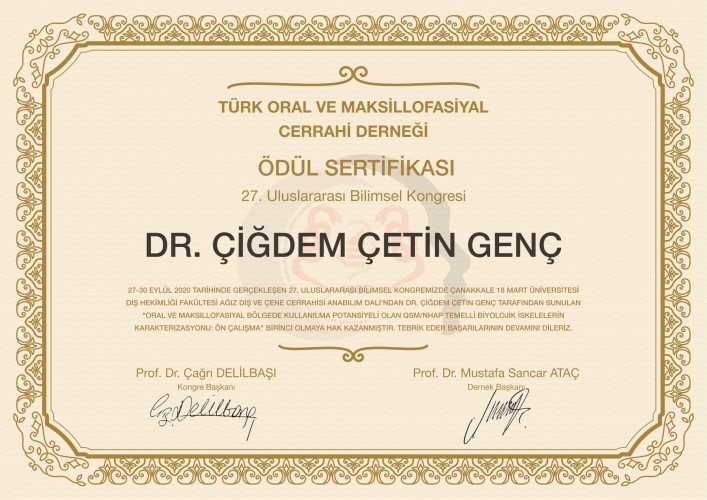 Çanakkale Onsekiz Mart Üniversitesi Diş Hekimliği Fakültesi Ağız, Diş ve Çene Cerrahisi Anabilim Dalı öğretim üyelerinden Dr. Öğr. Üyesi Çiğdem Çetin Genç, Türk Oral ve Maksillofasiyal Cerrahi Derneği’nin (TAOMS) düzenlediği 27. Uluslararası Bilimsel Kongresi’nde; “Oral ve Maksillofasiyal Bölgede Kullanılma Potansiyeli Olan QSM/nHAp Temelli Biyolojik İskelelerin Karakterizasyonu: Ön Çalışma” isimli araştırmasına dair yaptığı sunumla, “Sözlü Bildiri” kategorisinde Birincilik ödülüne layık görüldü. ÇOMÜ BAP birimi tarafından desteklenen TSA-2019-2933 nolu proje kapsamında hazırlanan çalışma, Mühendislik Fakültesi, Biyomühendislik bölümü, Doku Mühendisliği Anabilim Dalı Öğretim Üyesi Dr. Öğr. Üyesi Yavuz Emre Arslan, Araştırma görevlisi Hilal Deniz Yılmaz ve Yüksek Lisans öğrencisi Burak Karaca ortaklığı ile gerçekleştirildi.