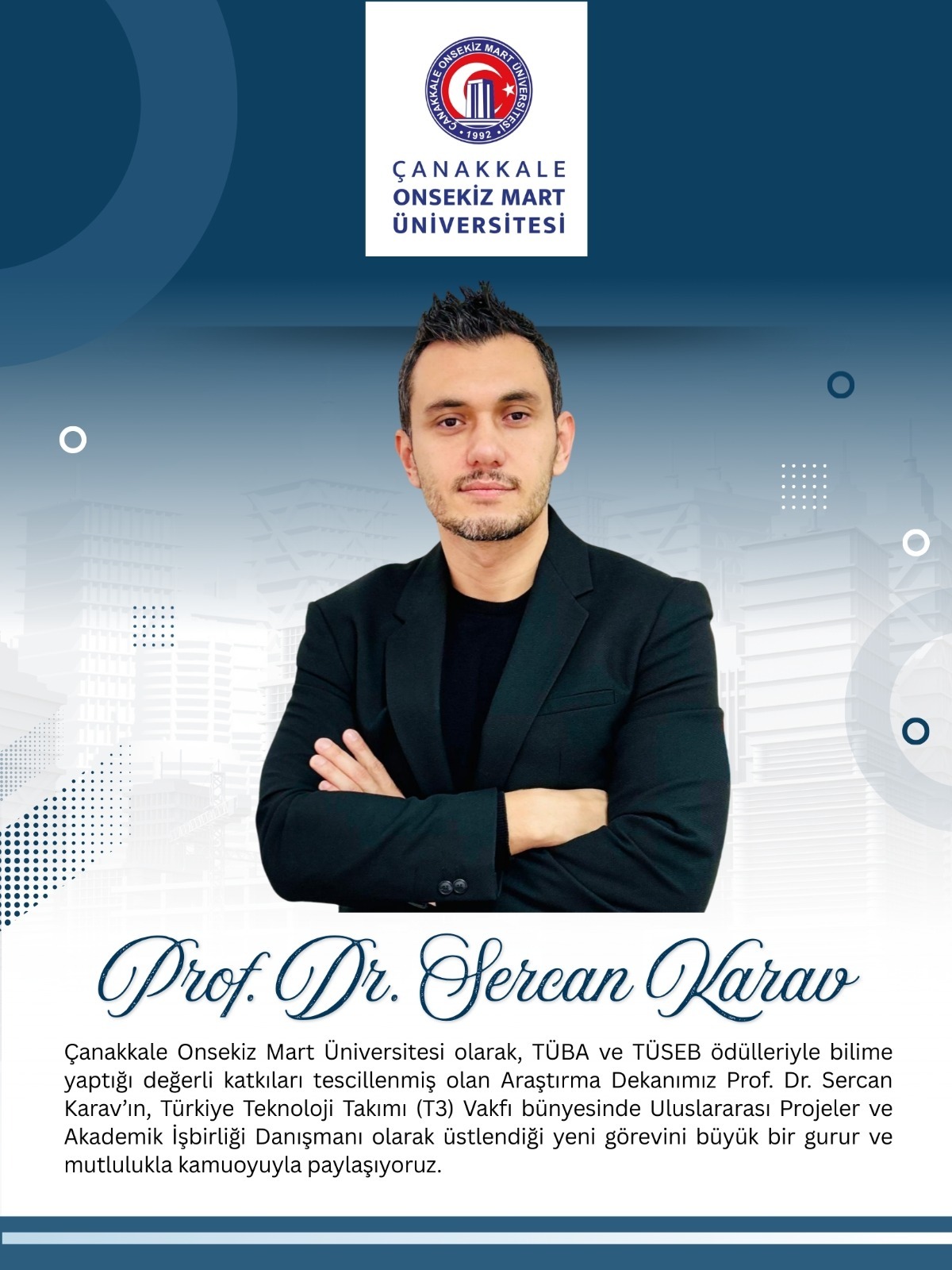 Çanakkale Onsekiz Mart Üniversitesi (ÇOMÜ) Araştırma Dekanı, TÜBA ve TÜSEB ödüllü bilim insanı Prof. Dr. Sercan Karav, Türkiye Teknoloji Takımı (T3) Vakfı bünyesinde Uluslararası Projeler ve Akademik İşbirliği Danışmanı olarak görevlendirildi. Çanakkale Onsekiz Mart Üniversitesi (ÇOMÜ) Araştırma Dekanı, bilimsel çalışmalarıyla ulusal ve uluslararası alanda önemli başarılara imza atan Prof. Dr. Sercan Karav, Türkiye Teknoloji Takımı (T3) Vakfı’nda önemli bir göreve getirildi. TÜBA ve TÜSEB ödülleriyle bilimsel katkıları tescillenen Prof. Dr. Karav, T3 Vakfı bünyesinde Uluslararası Projeler ve Akademik İşbirliği Danışmanı olarak görev yapacak. Bilimsel üretkenliği, güçlü akademik ağı ve yenilikçi bakış açısıyla ÇOMÜ’nün araştırma ekosistemine değer katan Prof. Dr. Karav’ın yeni görevi; Türkiye’nin bilim, teknoloji ve inovasyon alanındaki stratejik hedeflerine katkı sunmayı amaçlıyor. Özellikle uluslararası projeler ve akademik iş birliklerinin geliştirilmesi noktasında üstleneceği rolün, Türkiye’nin küresel bilim arenasındaki görünürlüğünü artırması bekleniyor. ÇOMÜ Rektörü Prof. Dr. R. Cüneyt Erenoğlu, Prof. Dr. Karav’ın yeni görevinin üniversite ve genç araştırmacılar için önemli bir motivasyon kaynağı olduğunu vurguladı. Rektör Erenoğlu yaptığı açıklamada, “Bilgi üretimini somut çıktılara dönüştüren, ulusal kalkınmayı destekleyen ve sürdürülebilir değer oluşturan akademik yaklaşımıyla öne çıkan Prof. Dr. Sercan Karav’ın bu görevi, üniversitemiz adına büyük bir gururdur. ÇOMÜ ailesi olarak; bilimin, araştırmanın ve yenilikçi düşüncenin dönüştürücü gücüne inanan tüm gençlerimizin, Prof. Dr. Karav’ın başarı hikâyesini ilham verici bir örnek olarak görmelerini tavsiye ediyoruz” ifadelerini kullandı. Rektör Erenoğlu, Prof. Dr. Karav’ı tebrik ederek yeni görevinde başarılarının artarak devam etmesini temenni etti.
