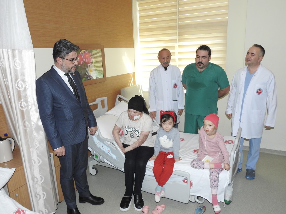 Açıklamanın ardından Rektör Prof. Dr. Erenoğlu, Plastik Rekonstrüktif ve Estetik Cerrahi Anabilim Dalı Başkanı Dr. Öğretim Üyesi Mustafa Akyürek ve beraberindekiler ÇOMÜ Hastanesi'nde tedavi olan 39 yaşındaki Khulkar Pırnazar ve kızları 5 yaşındaki Asila ile 6 yaşındaki İnoyot’u odasın ziyaret etti.